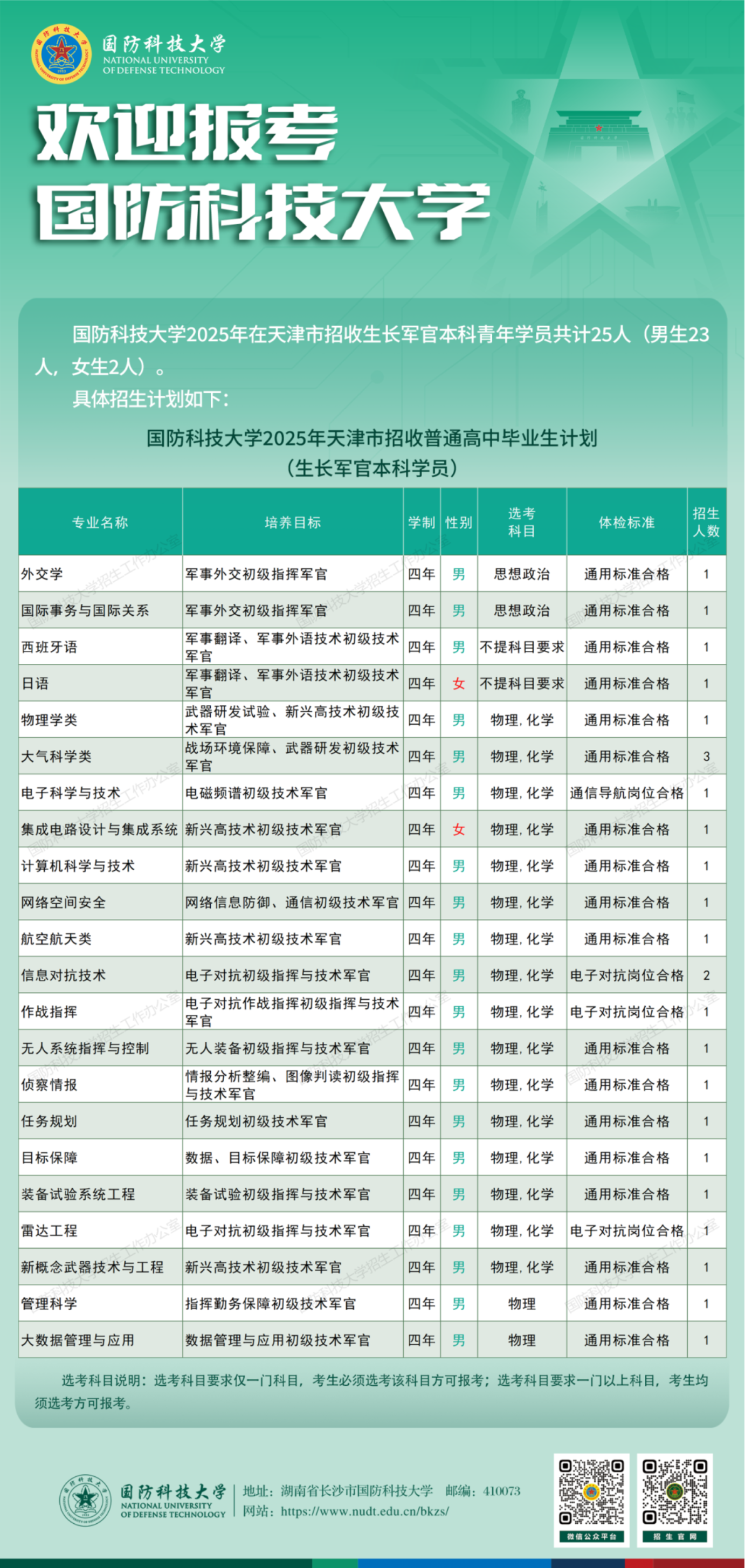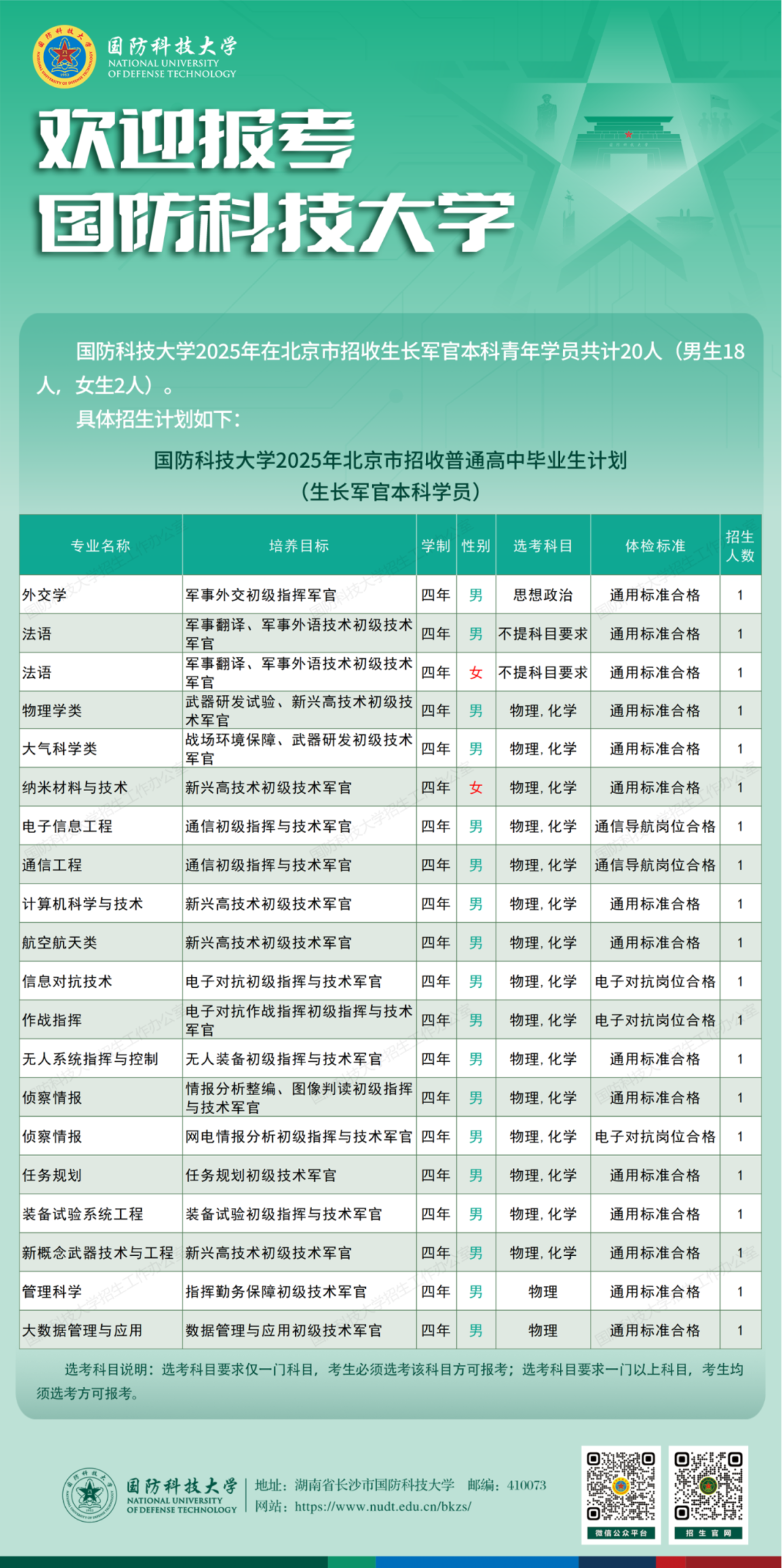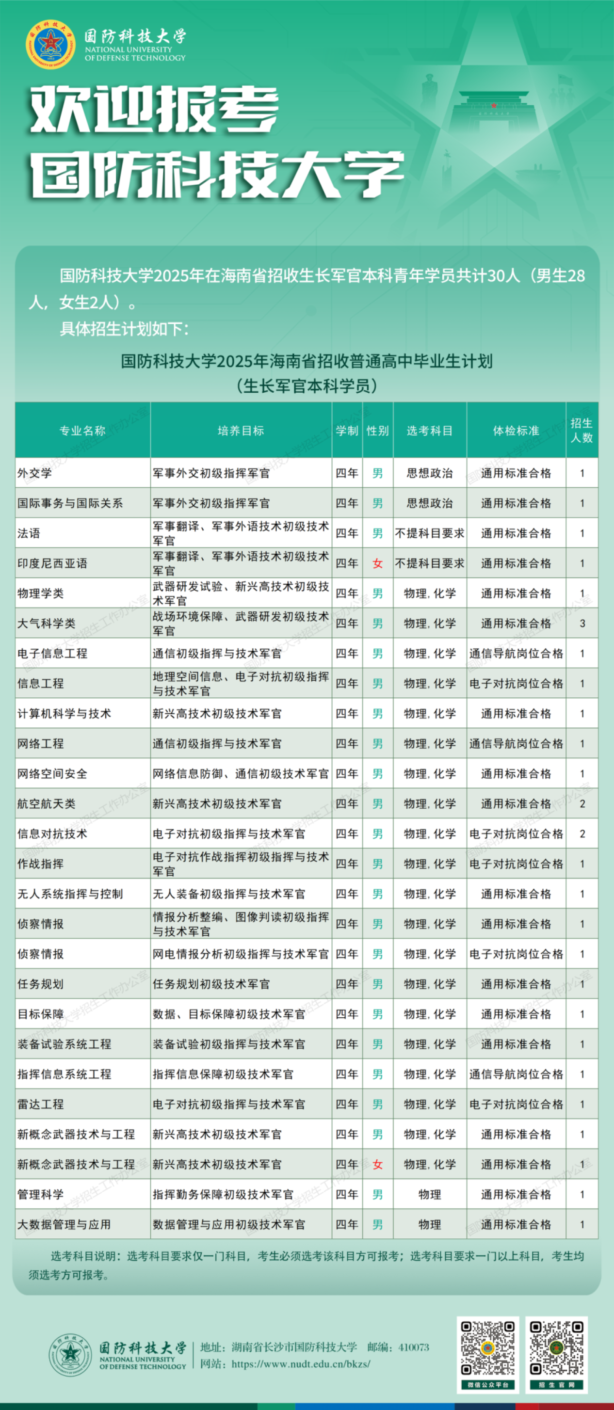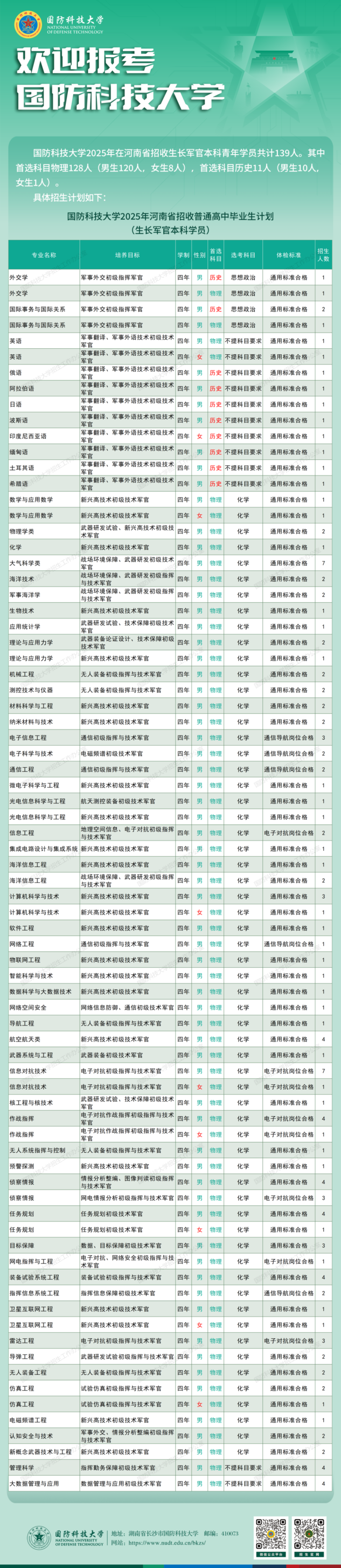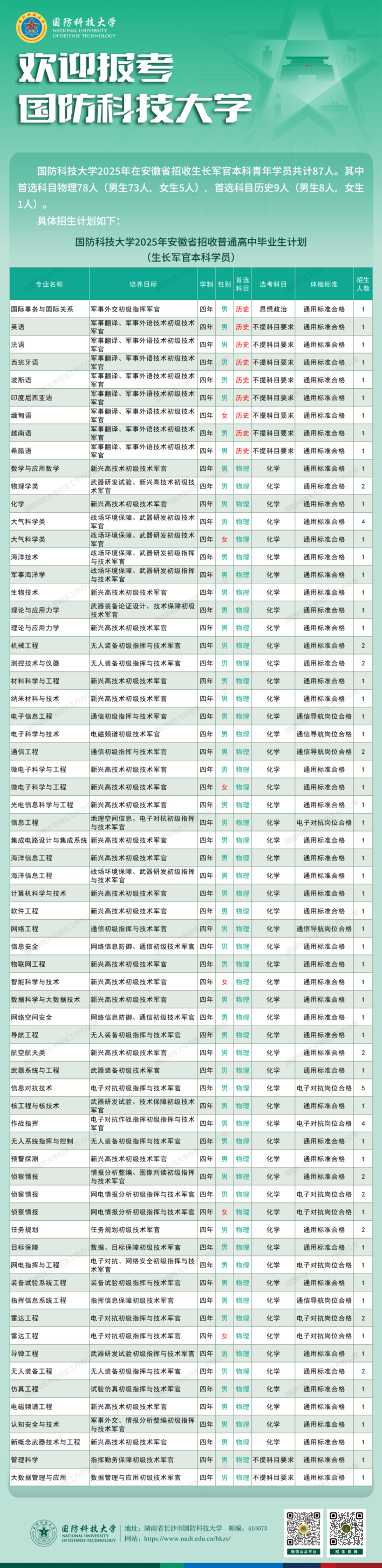 欢迎广大考生及家长电话咨询招生信息,欢迎有志携笔从戎、献身国防的共和国优秀学子和热血青年报考国防科大。