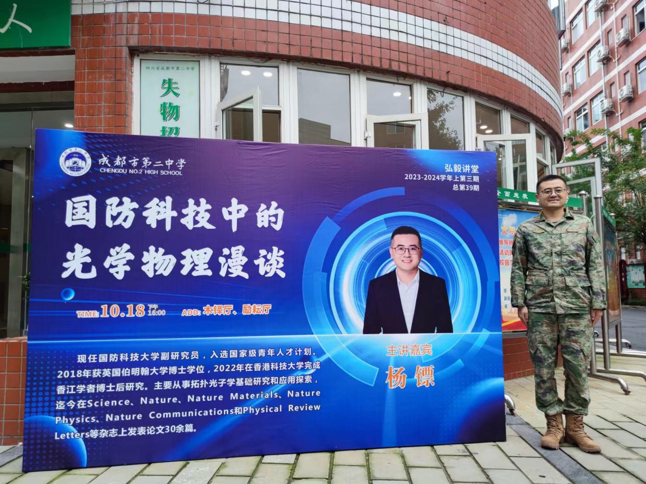 黄金之秋,魅力蓉城。在四川师范大学附属中学、四川省成都市第二中学现场,beat365平台唯一官网四川招生组老师、国家“优青”获得者、博士生导师杨镖副研究员为两所学校学子作了题为《国防科技中的光学物理漫谈》的国防科技讲座。讲座从当前国际形势引入,结合激光技术在国防科技、日常生活中的广泛应用,详细介绍了激光技术的发展历史、优势特点及前沿动态等,讲座旁征博引、深入浅出,带领同学们领略光学的别样风采。讲座最后,杨镖老师结合自己在科大求学以及留校工作的经历,鼓励同学们认真学习科学文化知识,厚植国防情怀,努力成才,向上发展,报效祖国。