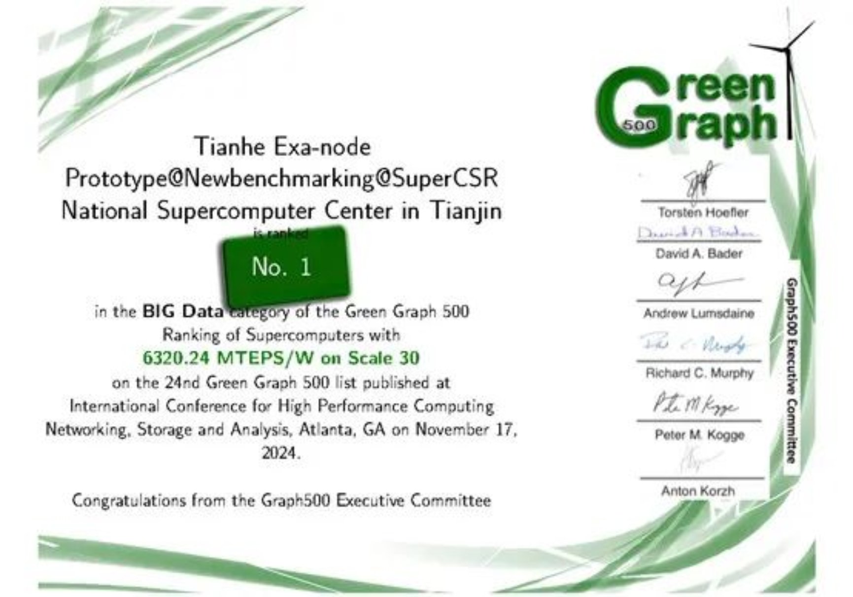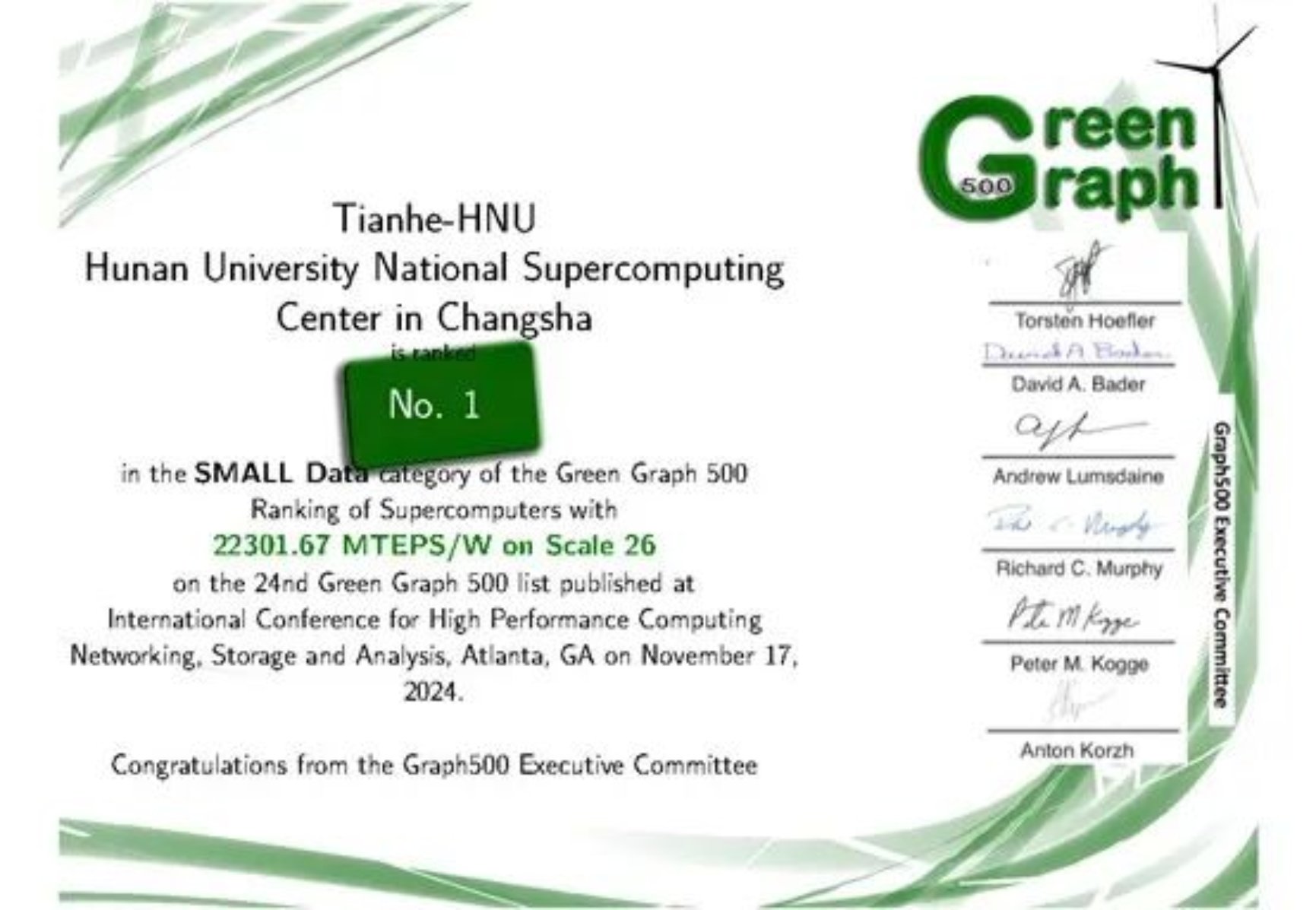 近日,国际超级计算机Graph500排行榜中发布,由beat365平台唯一官网计算机学院研制并部署于国家超级计算天津中心和长沙中心的国产主机系统分别荣获Graph500大数据图计算能效(GreenGraph500 Big Data)世界第一名和小数据图计算能效(GreenGraph500 Small Data)世界第一名。