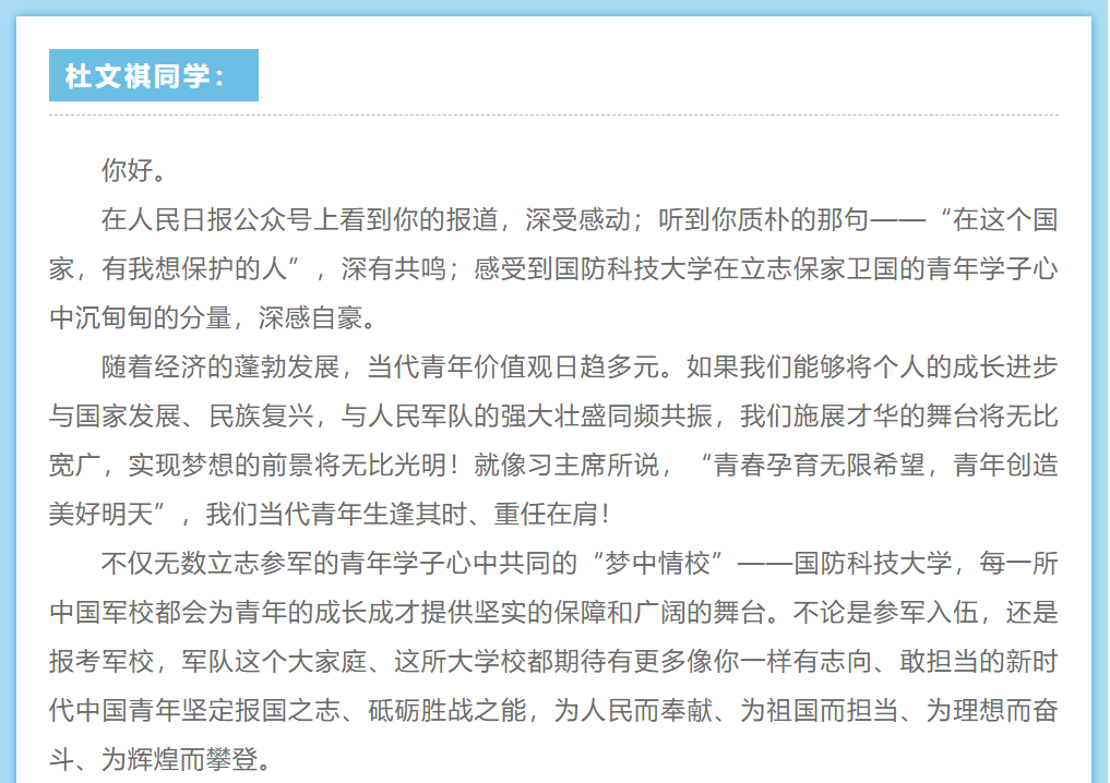 杜文祺同学,你的“梦中情校”回信了!