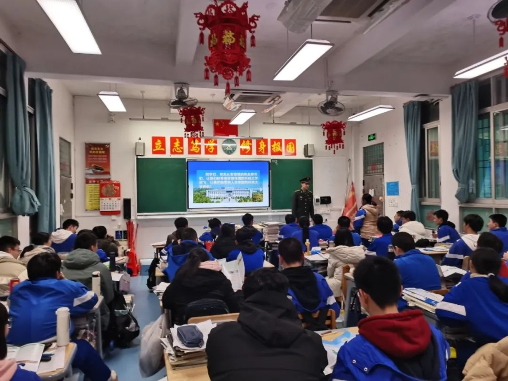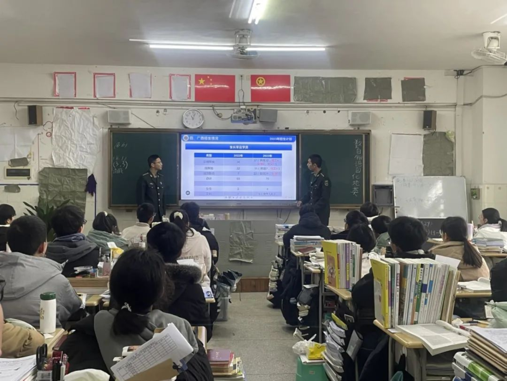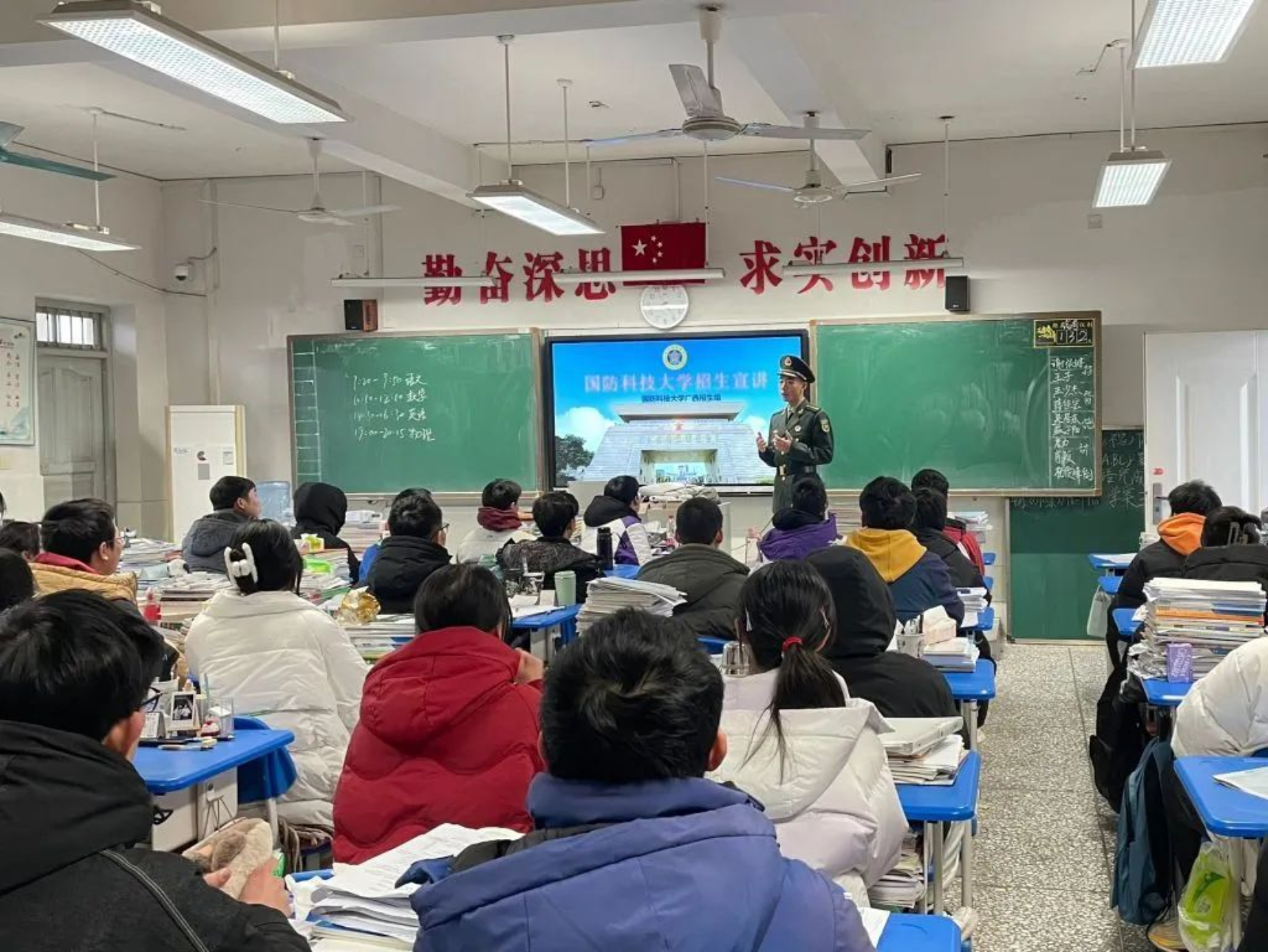 1月31日,由学校生长军官本科学员杨涛榕、谭卢潇霄、赵俊和、伍迪、周嘉惠和吴灏六人组成的汇报宣讲团来到南宁市第二中学进行宣讲。宣讲团在重点班级进行了宣讲答疑,同学们对国防科大表现出了浓厚的兴趣,纷纷咨询报考事宜。宣讲结束后,许多报考意愿强烈的同学通过学校考生服务系统登记了生源信息,希望获取更多学校资讯。同时,不少家长赞赏国防科大学员的年轻有为和踏实担当,希望自己的孩子能够像这些学员一样,穿上军装,从军报国,为新时代的强军事业贡献力量。