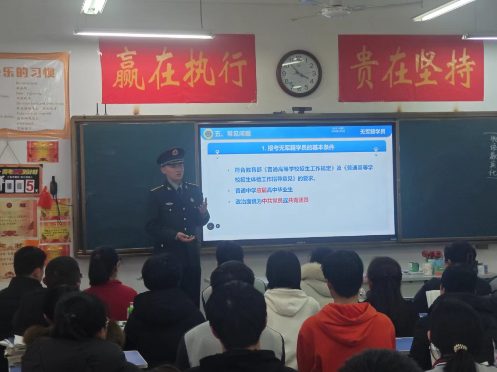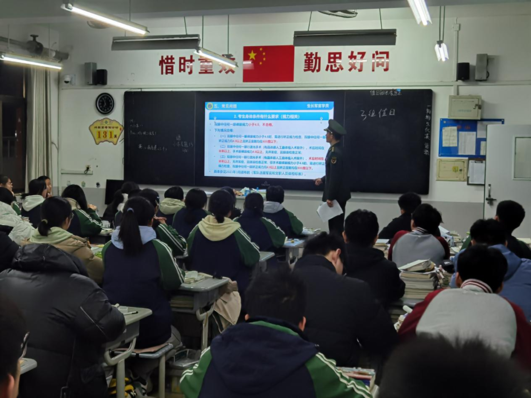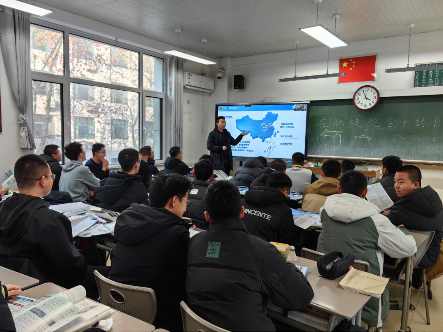 1月31日下午,由学校生长军官本科学员褚世杰、刘翔宇、孙宁浩组成的汇报宣讲团,前往具有百年历史的山东省重点高中——淄博第六中学进行宣讲。此次宣讲覆盖4个高三班级,共约200名同学参加,活动持续两个小时,内容涵盖学校的办学定位、使命愿景、人才培养、教学科研等多个方面。宣讲现场气氛热烈,同学们提问积极,展现了对科大的浓厚兴趣和向往。宣讲团成员则耐心细致地为同学们解答疑惑,分享了自己在科大的学习训练生活,同时介绍了科大的招生政策,进一步激发了同学们投身国防事业的热情。