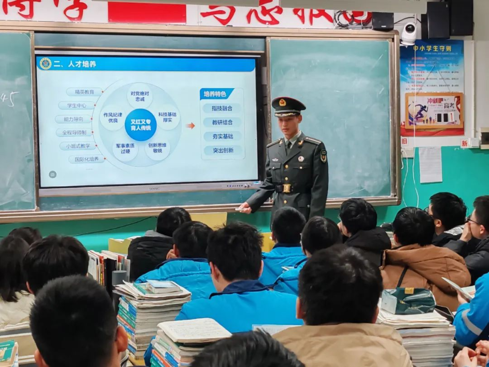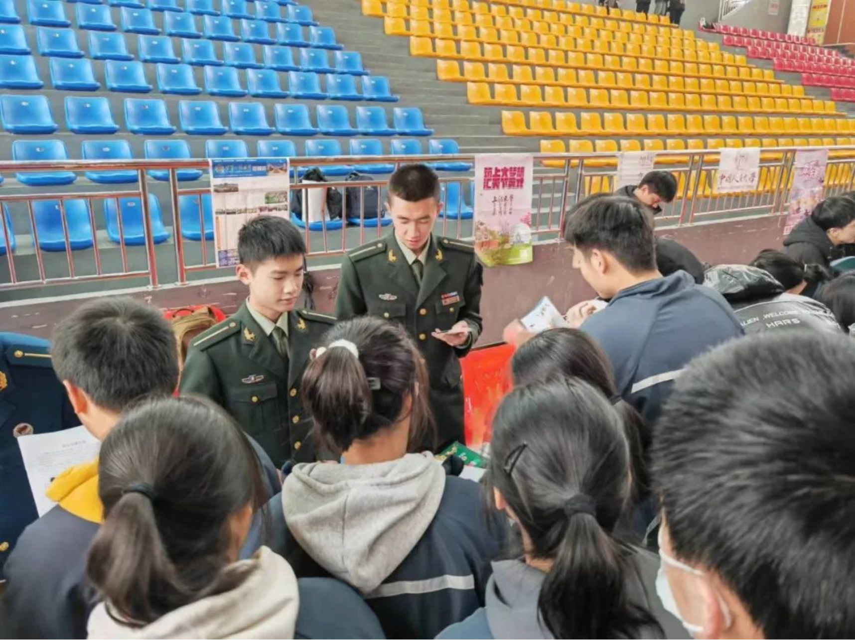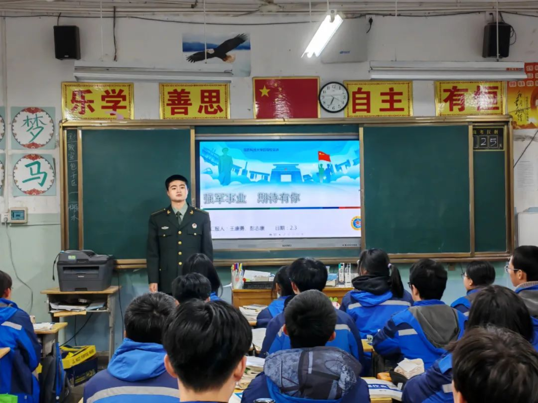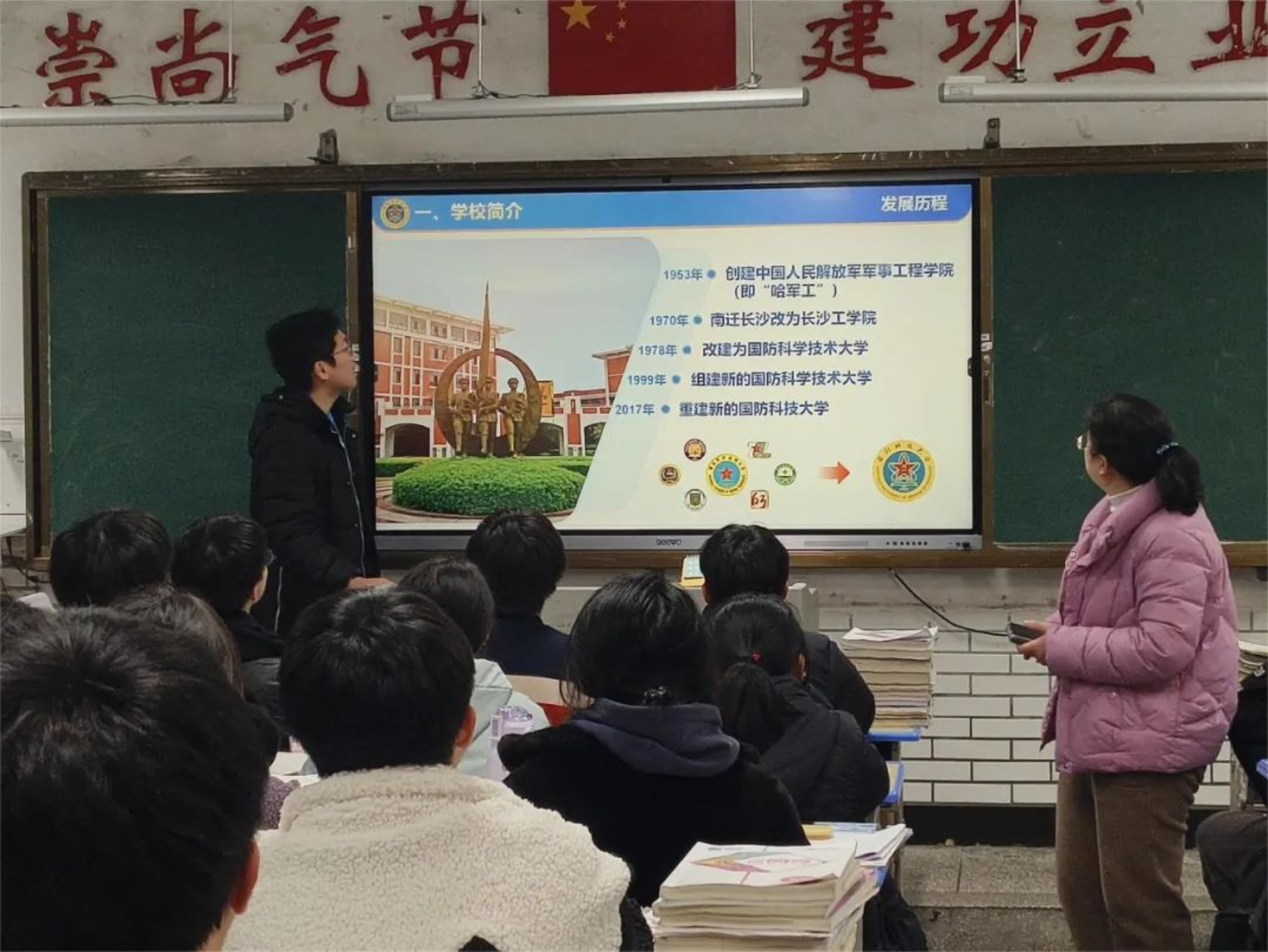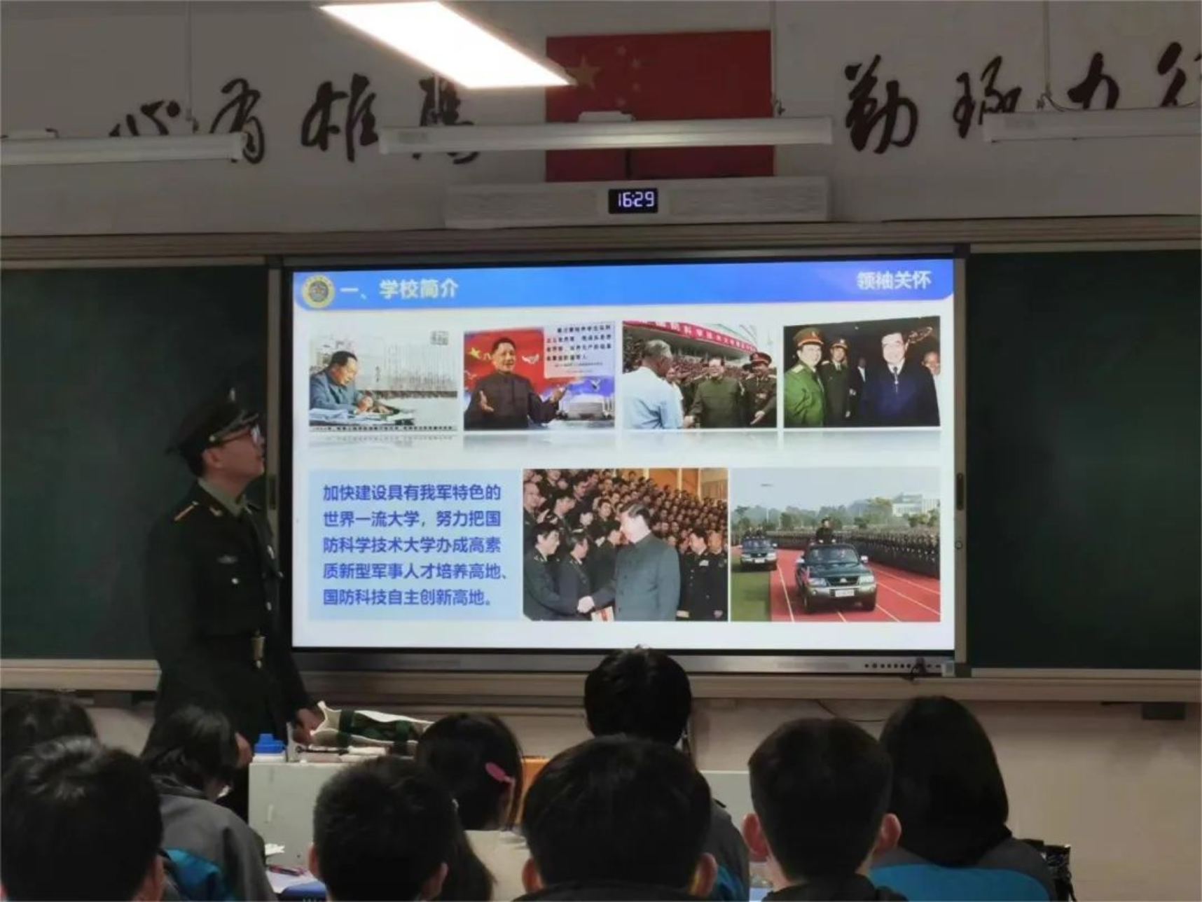为让更多的萍乡中学学子了解国防科大,激发大家献身国防事业的热情,毕业于萍乡中学的汇报宣讲团成员利用寒假走进母校,秉持“为学弟学妹答疑解惑,展现国防科大学员良好精神风貌”的原则,结合自身经历激发学弟学妹从军报国的热情,向学弟学妹讲解国防科大“应战而生,为军而盛”的光辉历史和强大的教学科研实力。汇报宣讲团成员还为有意向报考国防科大、立志从军报国的同学们发放学校主题文创物品,鼓励他们将理想化作学习的动力,以积极向上的精神面貌投入到学习生活中去。