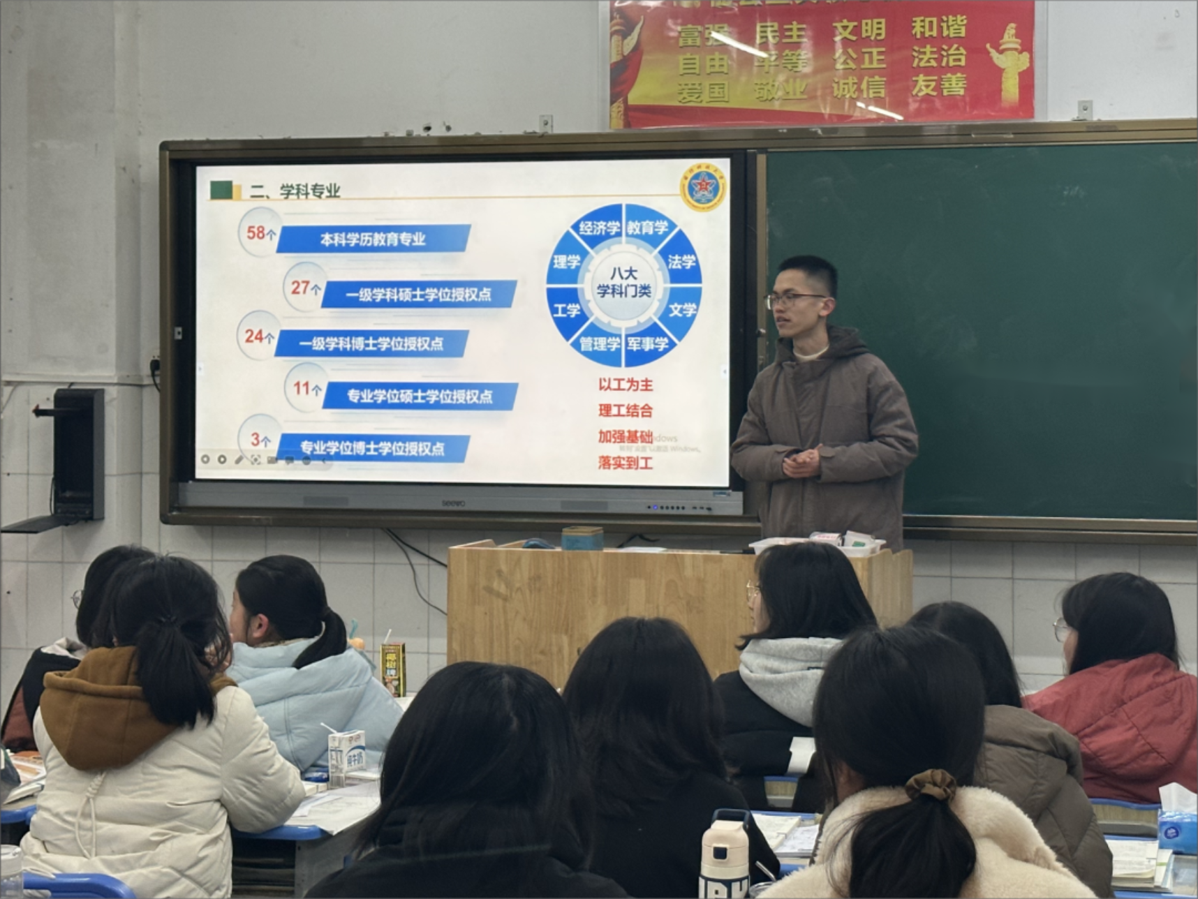 1月30日,在福建招生组老师们的带领下,生长军官本科学员黄熠杭回到母校福州高级中学针对重点班的同学开展专题宣讲。宣讲采取演示课件和播放视频相结合的形式,全方位立体地向高三的同学们讲解学校历史、人才培养、招生政策等方面内容,并结合个人生活vlog展示了科大学员风采。宣讲结束后,黄熠杭和学弟学妹们进行深入的交流,详细耐心地向前来咨询的同学们答疑解惑。