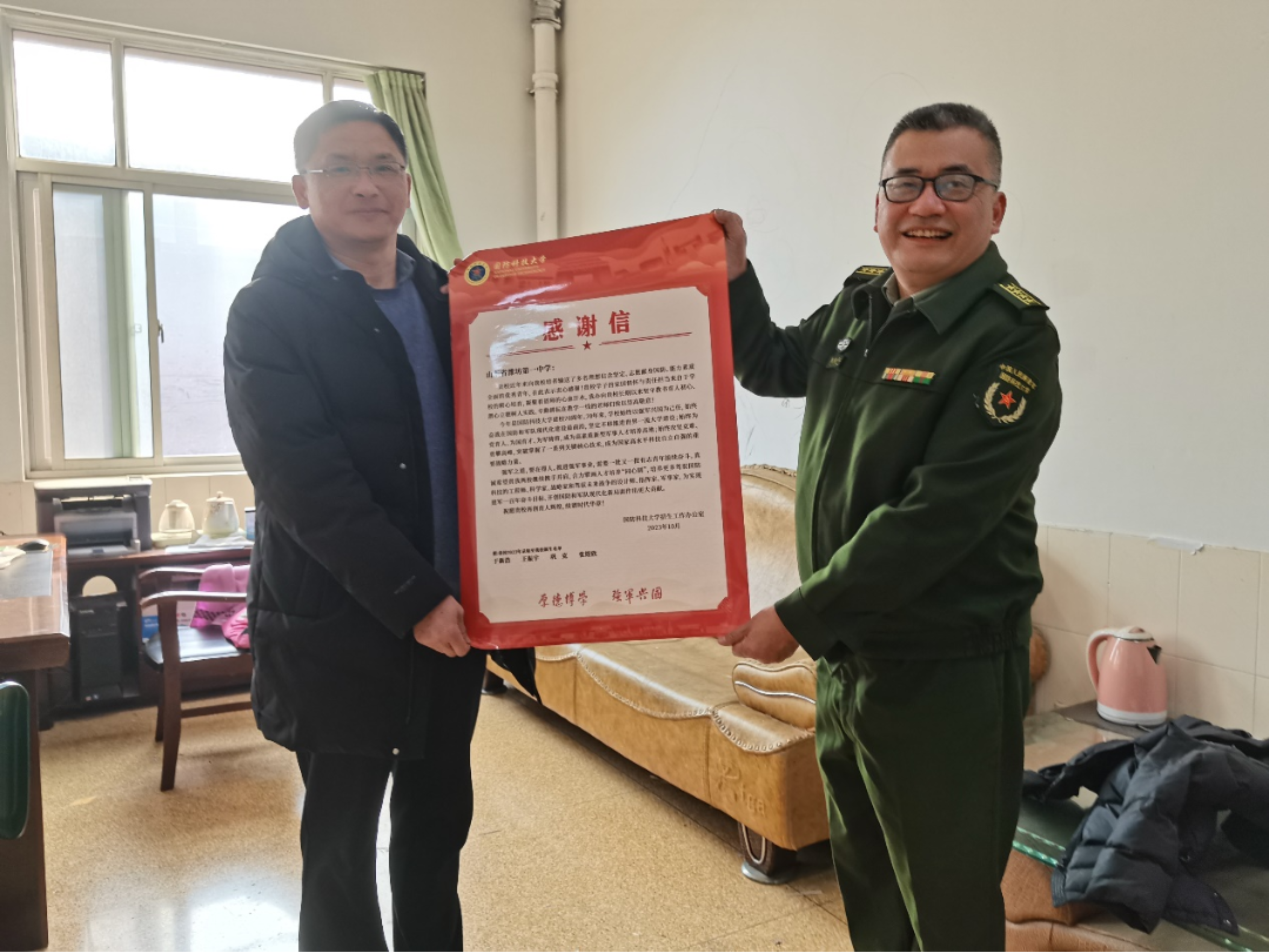 活动当天下午,银装素裹的潍坊一中显得格外庄严肃穆。李爱平教授代表学校招办向潍坊一中校领导递送了感谢信,正式拉开汇报宣讲活动的序幕。