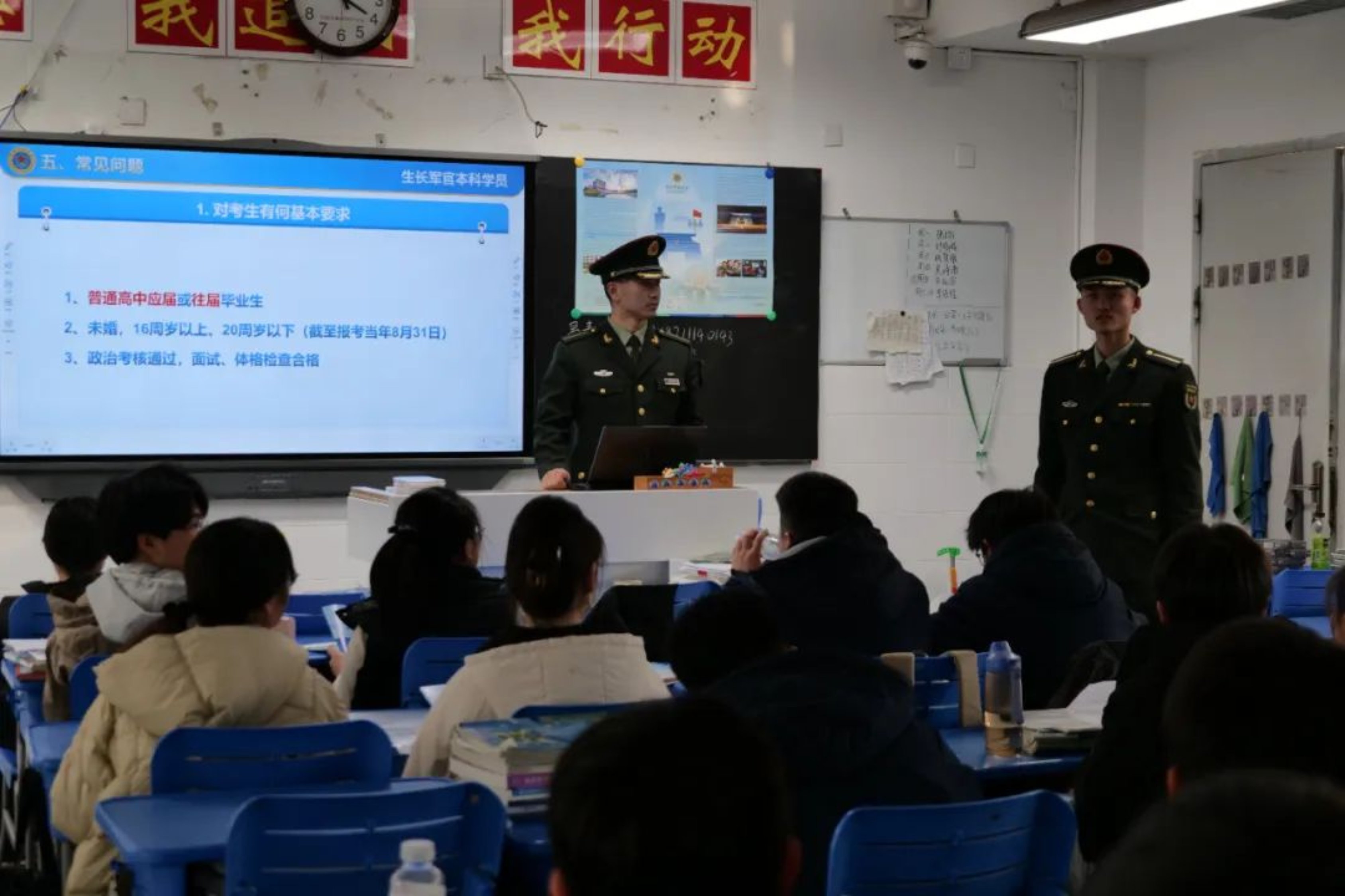 近日,六名毕业于陕西省西安中学的科大学子重返母校,开展了一场别开生面的招生宣传活动。此次宣讲活动采取集中宣讲和进班宣讲相结合的方式,全方位、多角度地向学弟学妹们展示科大的风采。在集中宣讲环节,宣讲团结合个人成长经历介绍科大的基本情况和军校生活,并分享学习备考经验,为学弟学妹进行一对一答疑。同学们对科大学习生活兴趣浓厚,与宣讲团成员积极交流,仔细询问日常生活、体能训练等问题。随后,宣讲团成员走进多个班级,分享成长故事,进一步答疑解惑,鼓励更多同学投身国防事业,并向大家赠送科大主题文创产品。