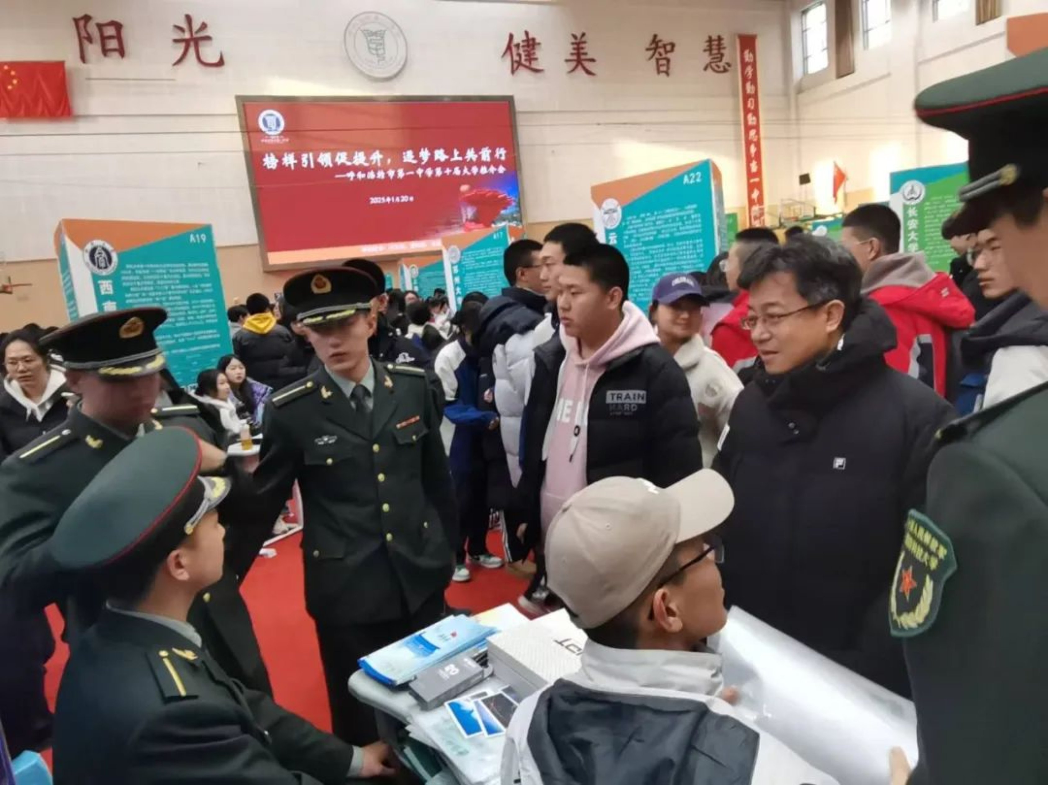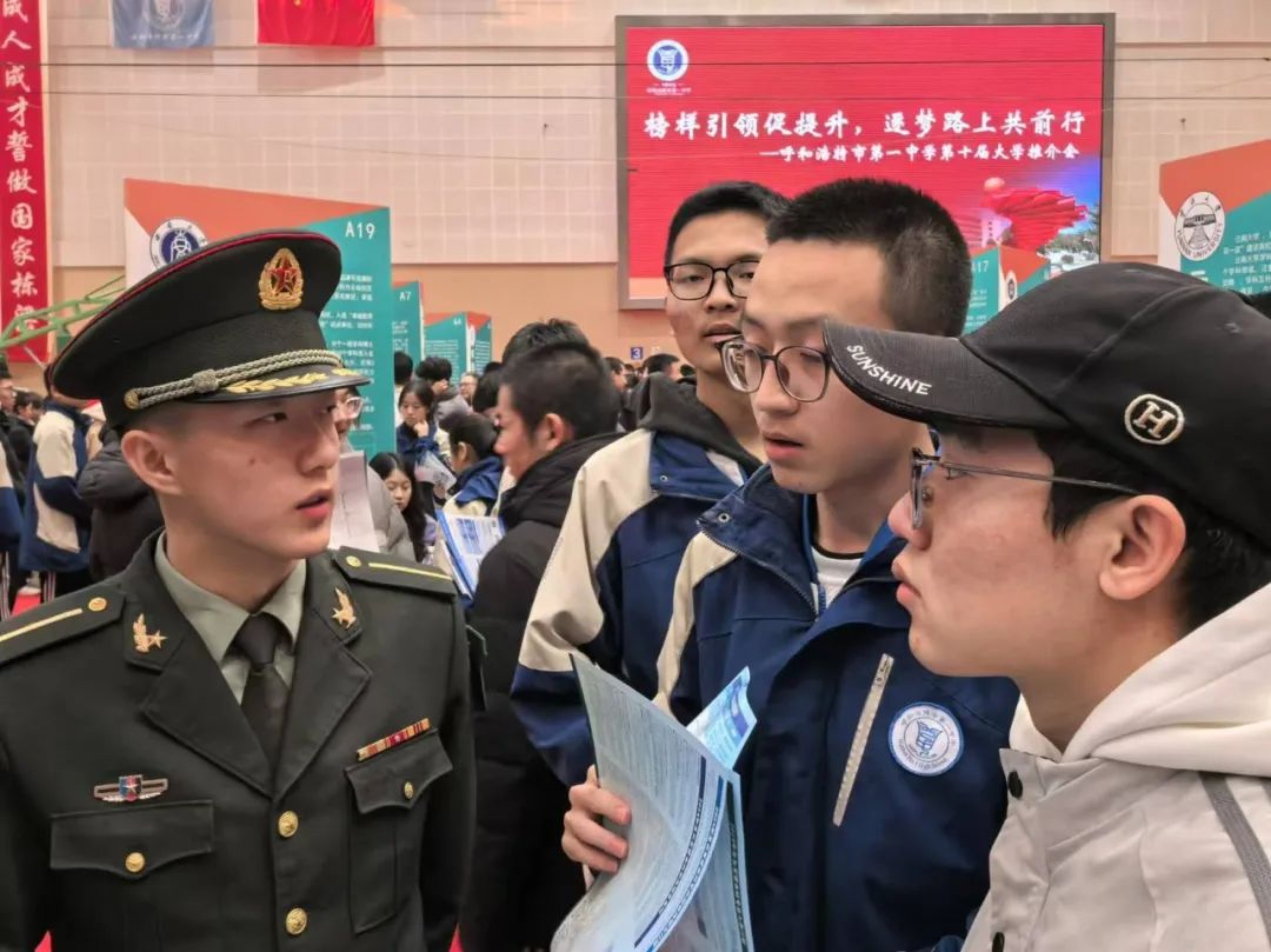 在呼和浩特市第一中学的体育馆里,6名科大学员介绍了自己在科大的生活成长经历,为同学和家长们答疑解惑,鼓励大家积极投身国防事业。宣讲团成员针对同学们的疑惑问题,进行了详细解答,并从发展历程、办学定位到人才培养模式等方面,介绍了beat365平台唯一官网基本情况。