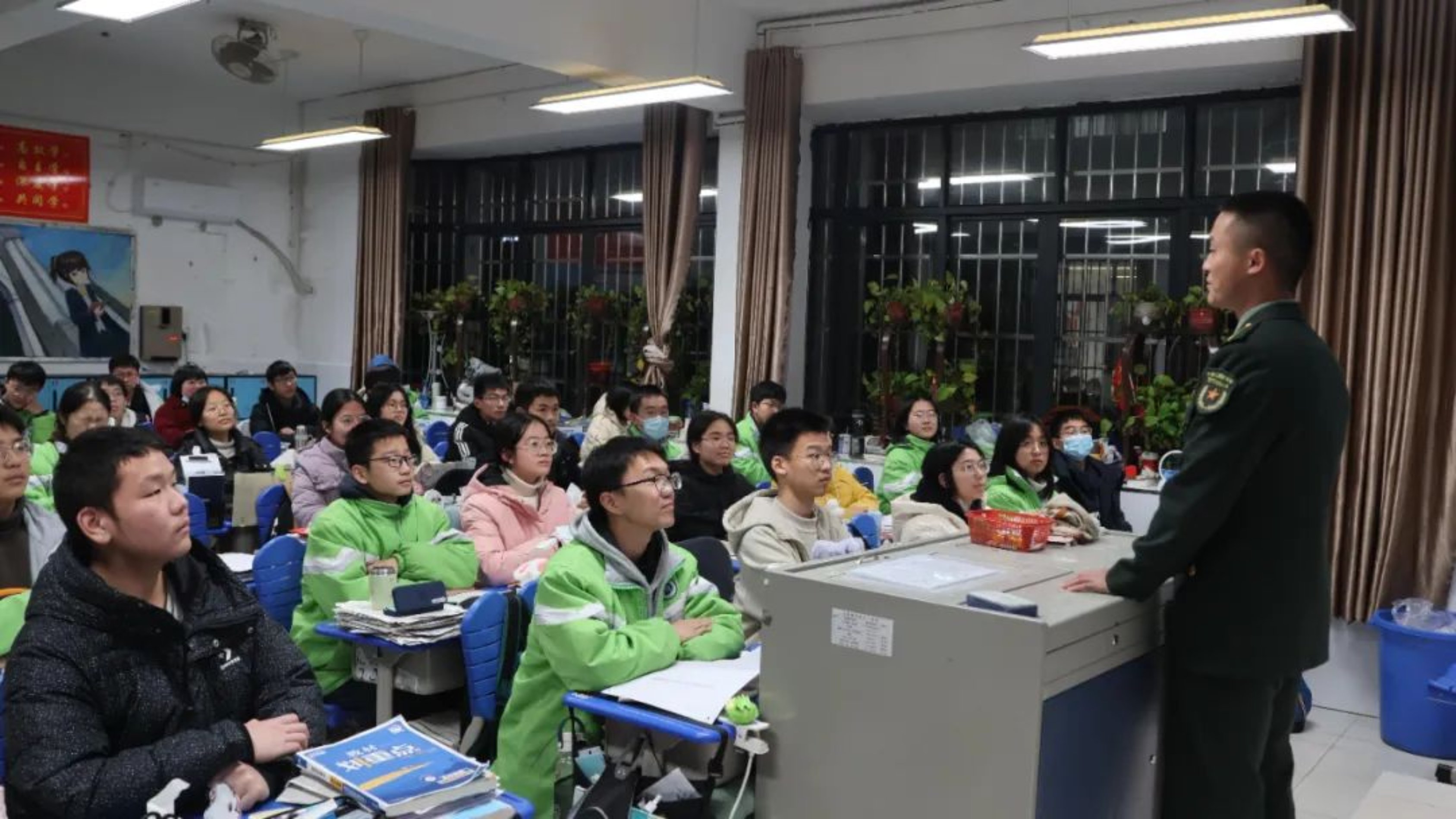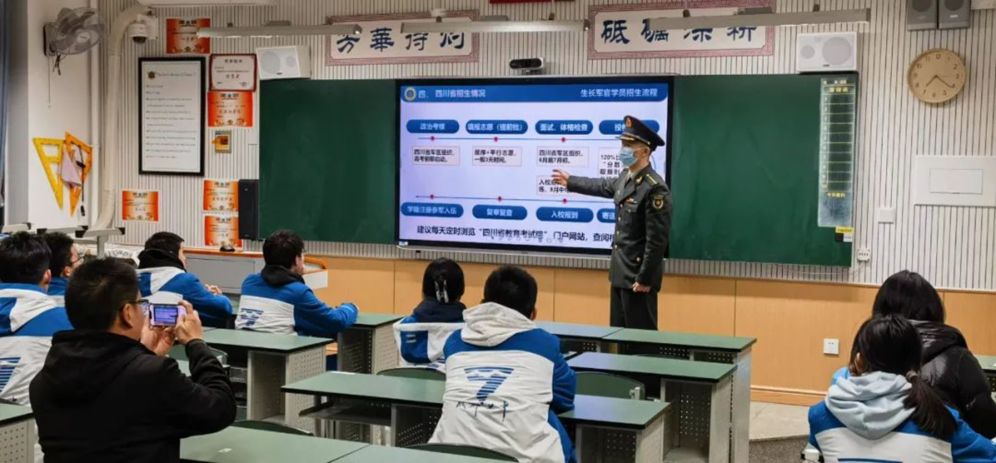 在芙蓉书院一楼大厅,四川招生组王国臣老师以及2名毕业于成都七中的科大学子向高中同学们介绍了国防科大的基本情况、办学条件、招生标准、日常生活等方面的内容。随后,宣讲团前往芙蓉书院106教室宣讲,对同学们关于报考科大相关要求的疑问给予耐心解答,并引导有意向报考科大的同学关注学校招生公众号,方便第一时间掌握招考信息。