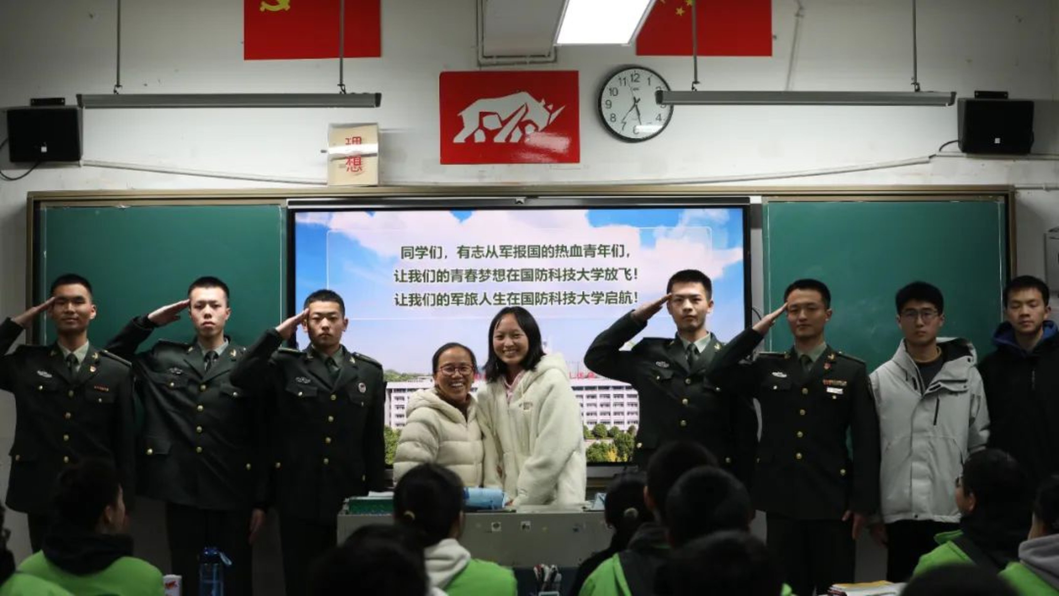 身着戎装,重返母校,向老师汇报学习情况,向学弟学妹们分享科大的精彩生活,我倍感骄傲与自豪。同学们期待的目光和热烈的掌声让我感觉不虚此行。我们宣传的是军旅绿和热血红交织的多彩人生。希望有更多有志青年加入国防科大,加入到强军事业当中。