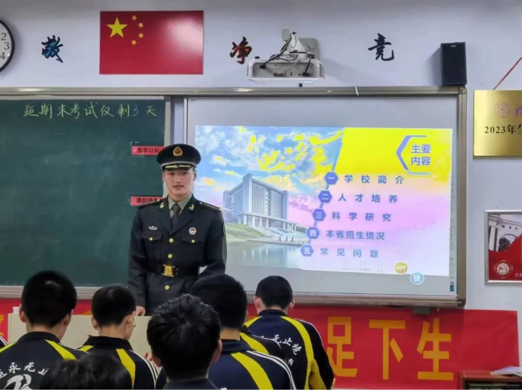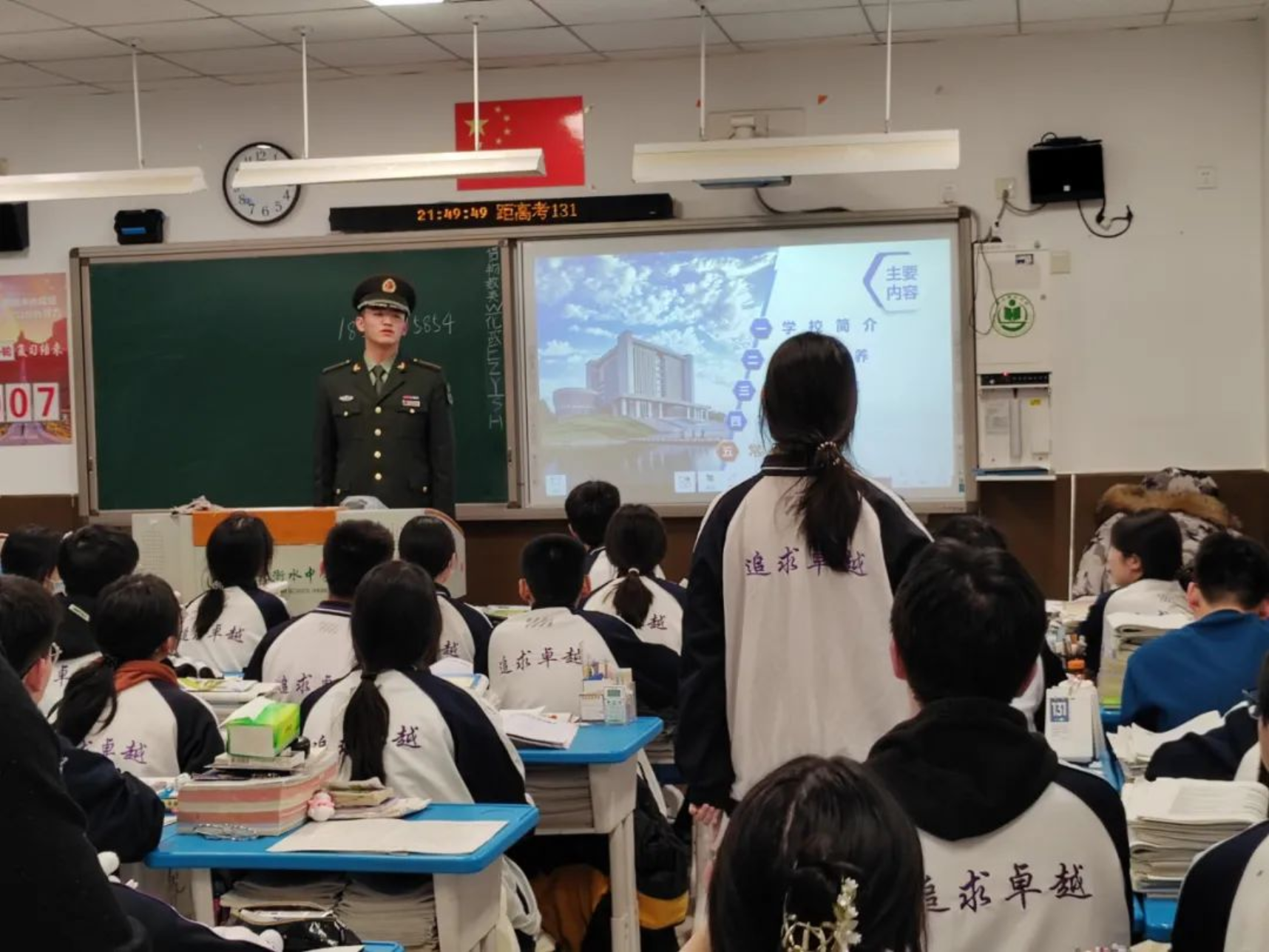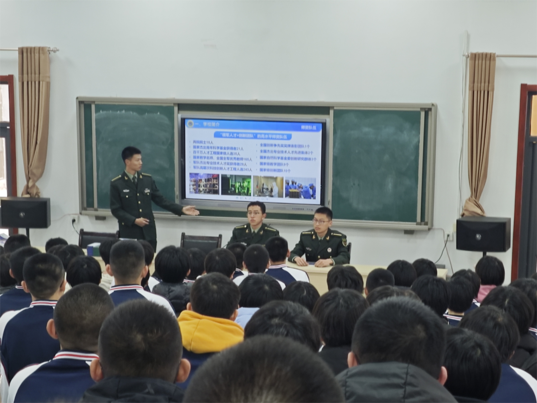 寒假期间,学校生长军官本科学员郭佳璇、李闻斌、张旭阳、陈永哲、张子晗、段旭荣组成的“高地新星”汇报宣讲团来到河北省武安市第一中学,给2500名武安一中学子带来了一场别开生面的国防科技讲座和招生宣讲,宣讲会采用“专题讲座+对点答疑”的形式,不仅拓宽了同学们的视野,更点燃了他们投身科学、献身国防的热情。
