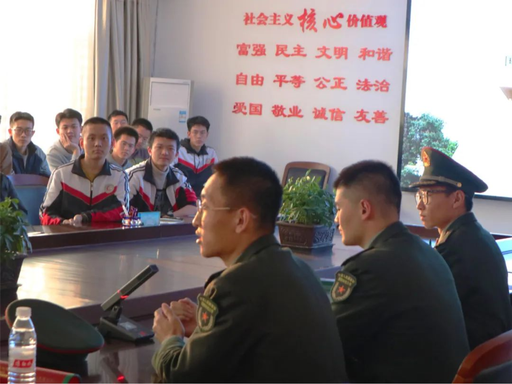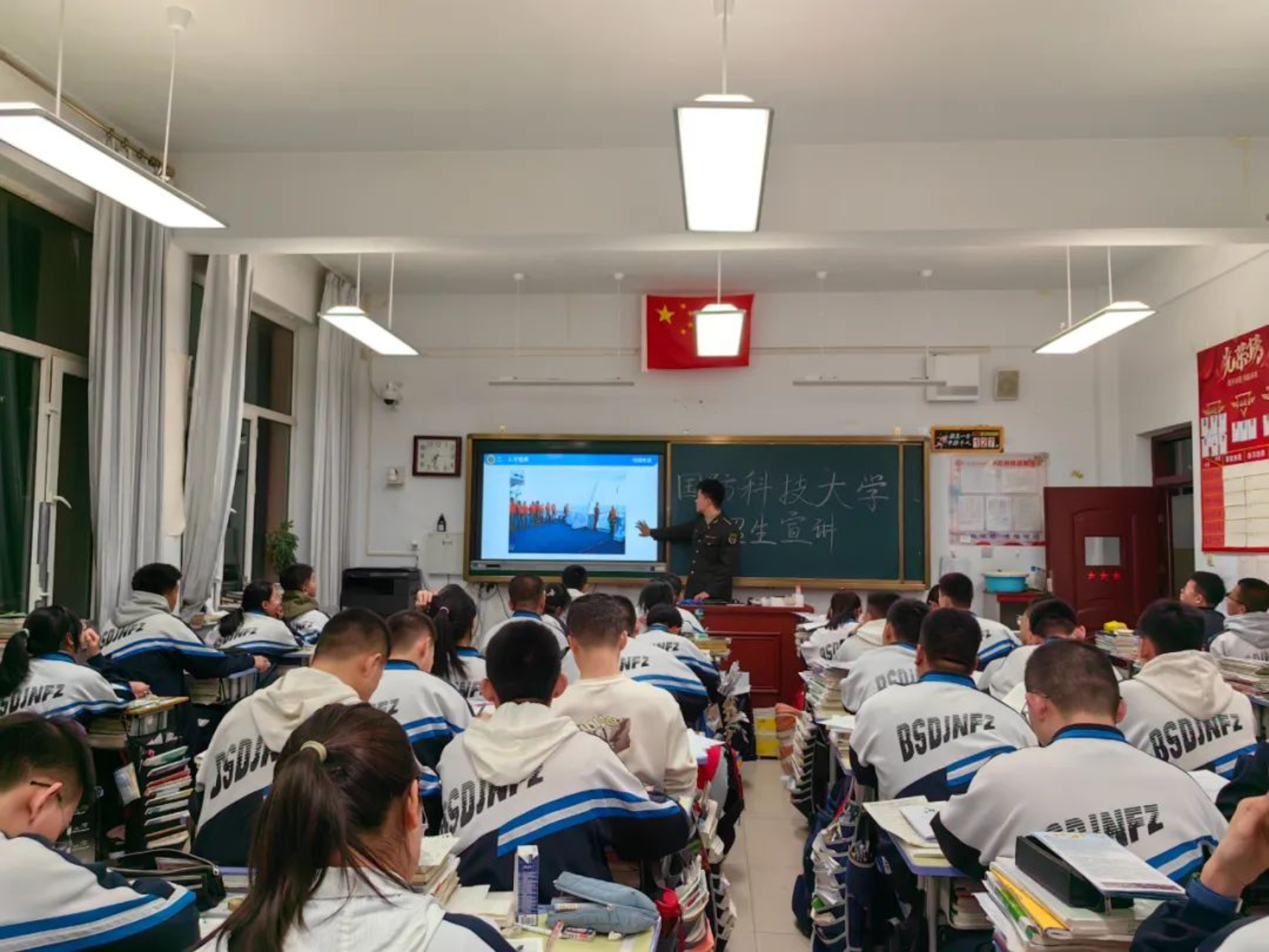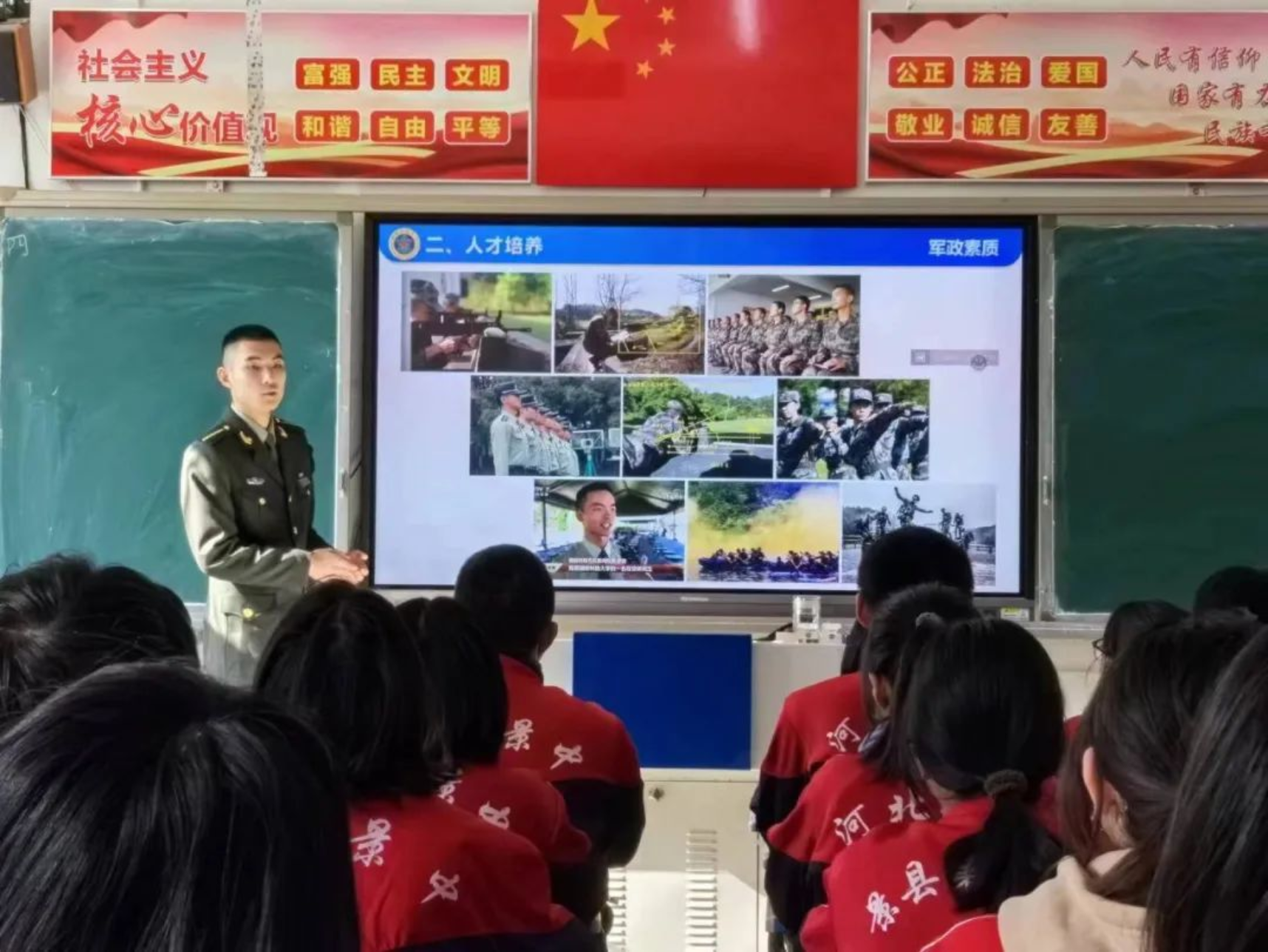寒假期间,学校生长军官本科学员郭佳璇、李闻斌、张旭阳、陈永哲、张子晗、段旭荣组成的“高地新星”汇报宣讲团来到河北省武安市第一中学,给2500名武安一中学子带来了一场别开生面的国防科技讲座和招生宣讲,宣讲会采用“专题讲座+对点答疑”的形式,不仅拓宽了同学们的视野,更点燃了他们投身科学、献身国防的热情。