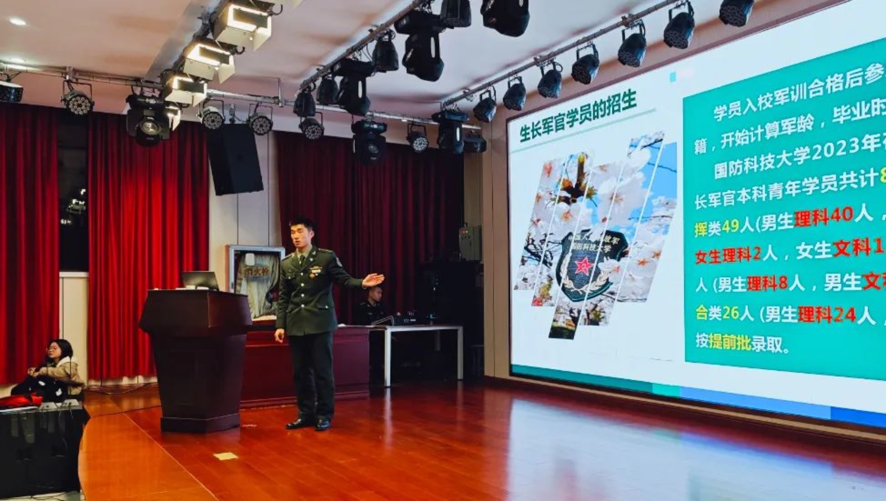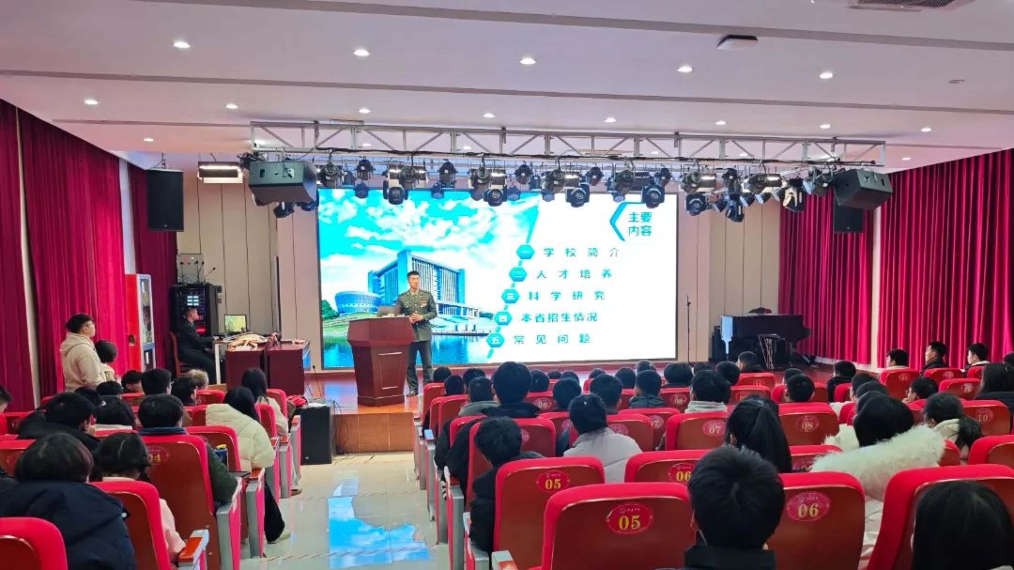 宣讲现场,汇报宣讲团成员结合自身经历,生动详细地阐述了国防科大的教育理念、培养模式以及丰富多彩的校园生活等。他们的介绍让在场的学弟学妹们对军校生活有了更为真切、立体的感知。同时针对高三阶段的学习挑战,他们分享了实用的学习策略和心态调整方法,激励学弟学妹们以坚定的信念和昂扬的斗志迎接挑战,勇敢追梦。