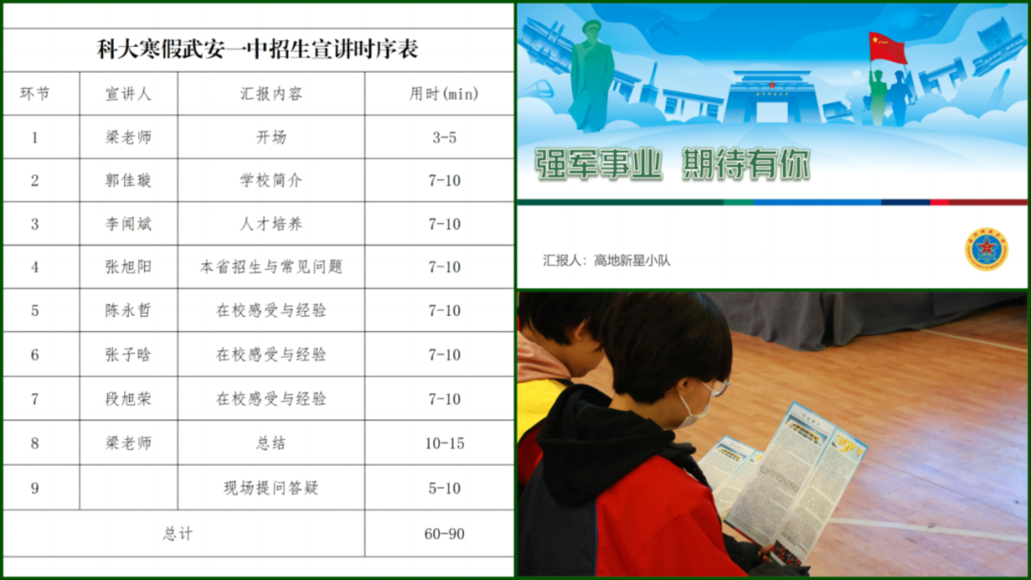 2022级生长军官本科学员段旭荣:毕业两年后再回母校,我心中充满感慨。想起当年我也曾在这里汇报自己的梦想,最终通过努力考入科大。在宣讲中,我分享了自己在科大的学习和生活经历,认真解答学弟学妹们的疑问。我深感此次活动意义重大,希望通过我的分享,能够帮助更多有志于从军报国、献身国防的学子更全面地了解科大。
