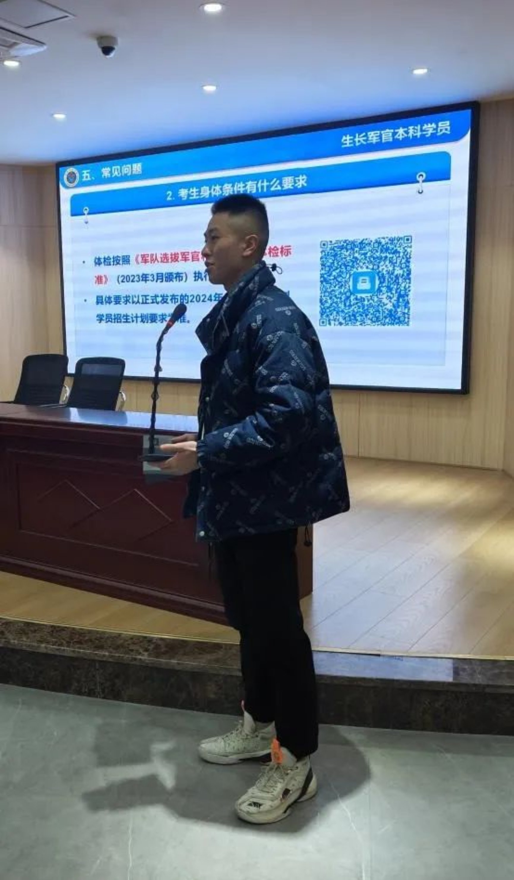 2021级无军籍地方本科学员熊峰:作为一名无军籍学员,此次母校宣讲对我而言具有非凡意义。当我目睹学弟学妹们满怀热情地涌入宣讲会场,他们对科大的好奇与向往,让我不禁回想起当年的自己。在宣讲中,我详尽地介绍国防科大无军籍学员招生政策、培养模式及就业前景等,让许多同学了解无军籍这一招生类别的特点和优势,成功激发了他们的浓厚兴趣。