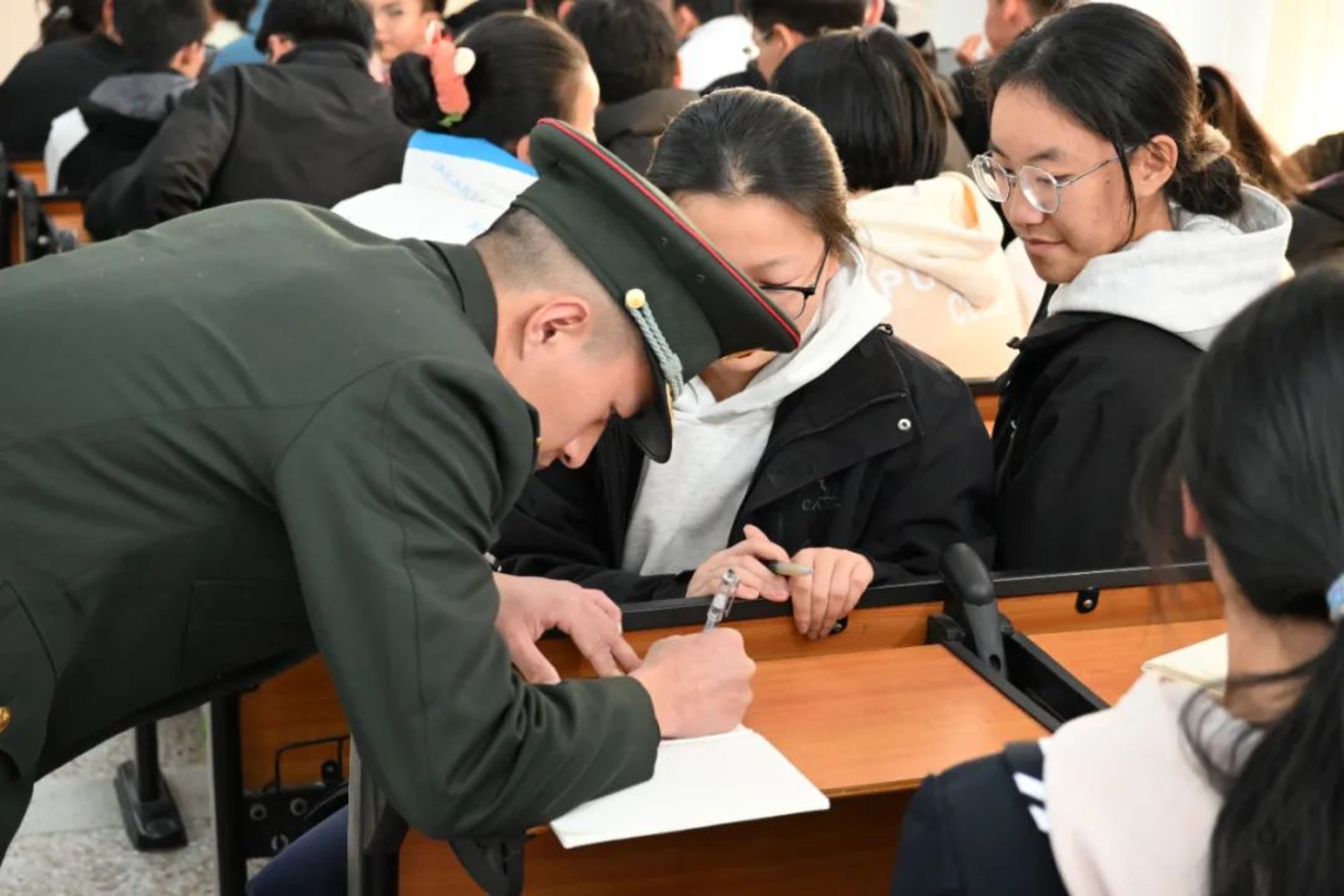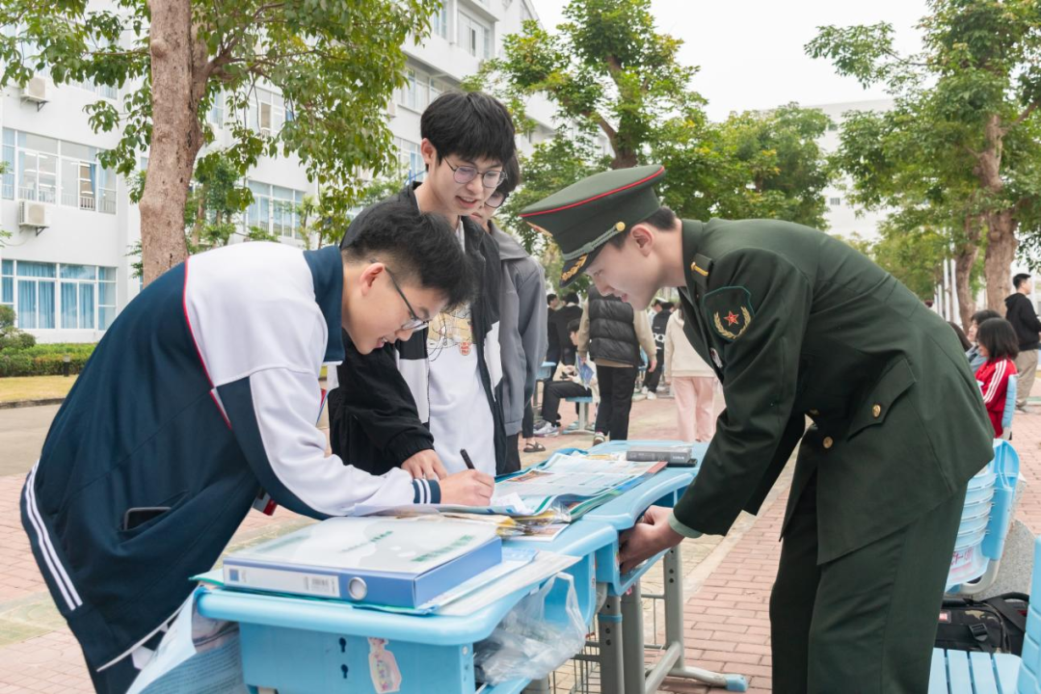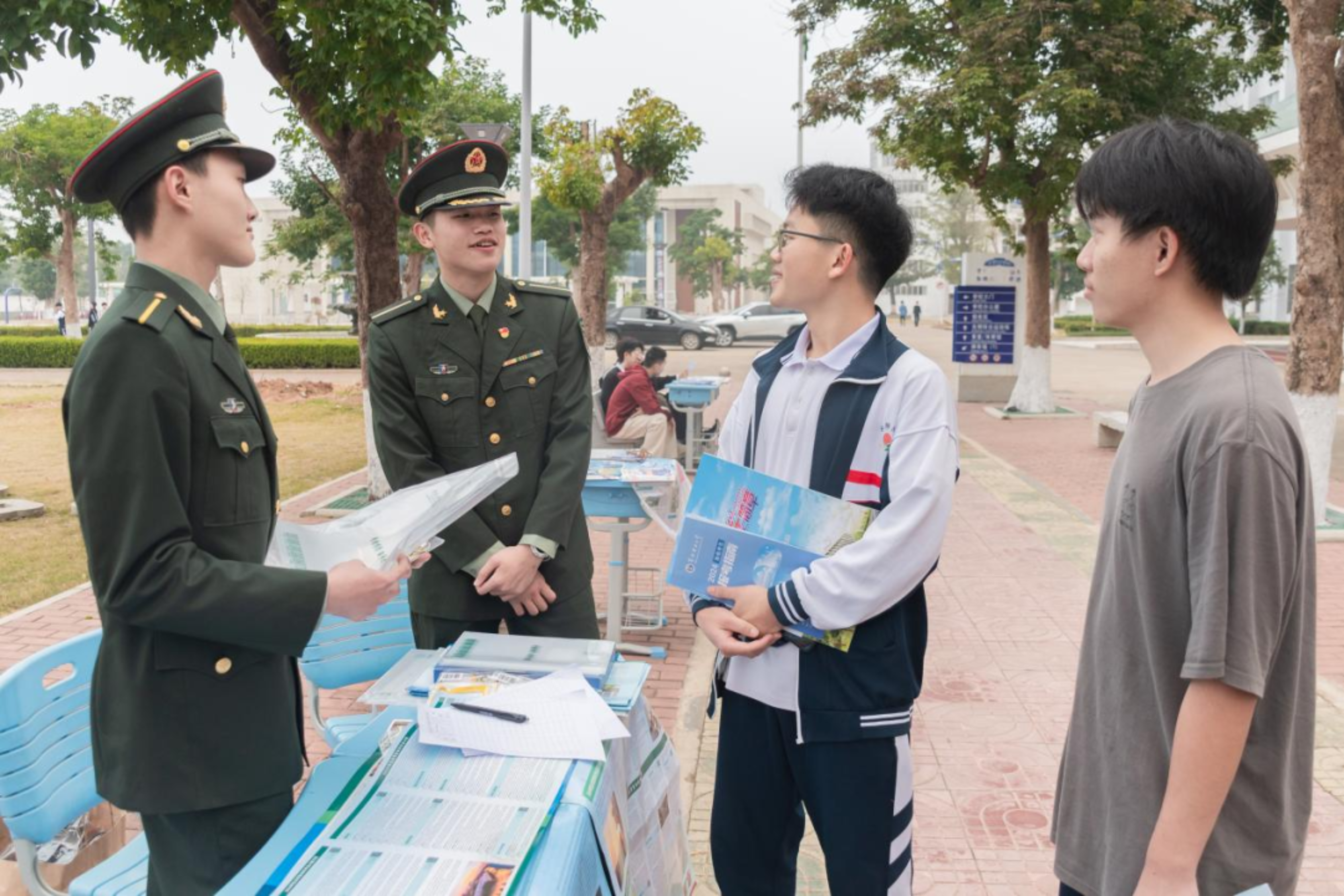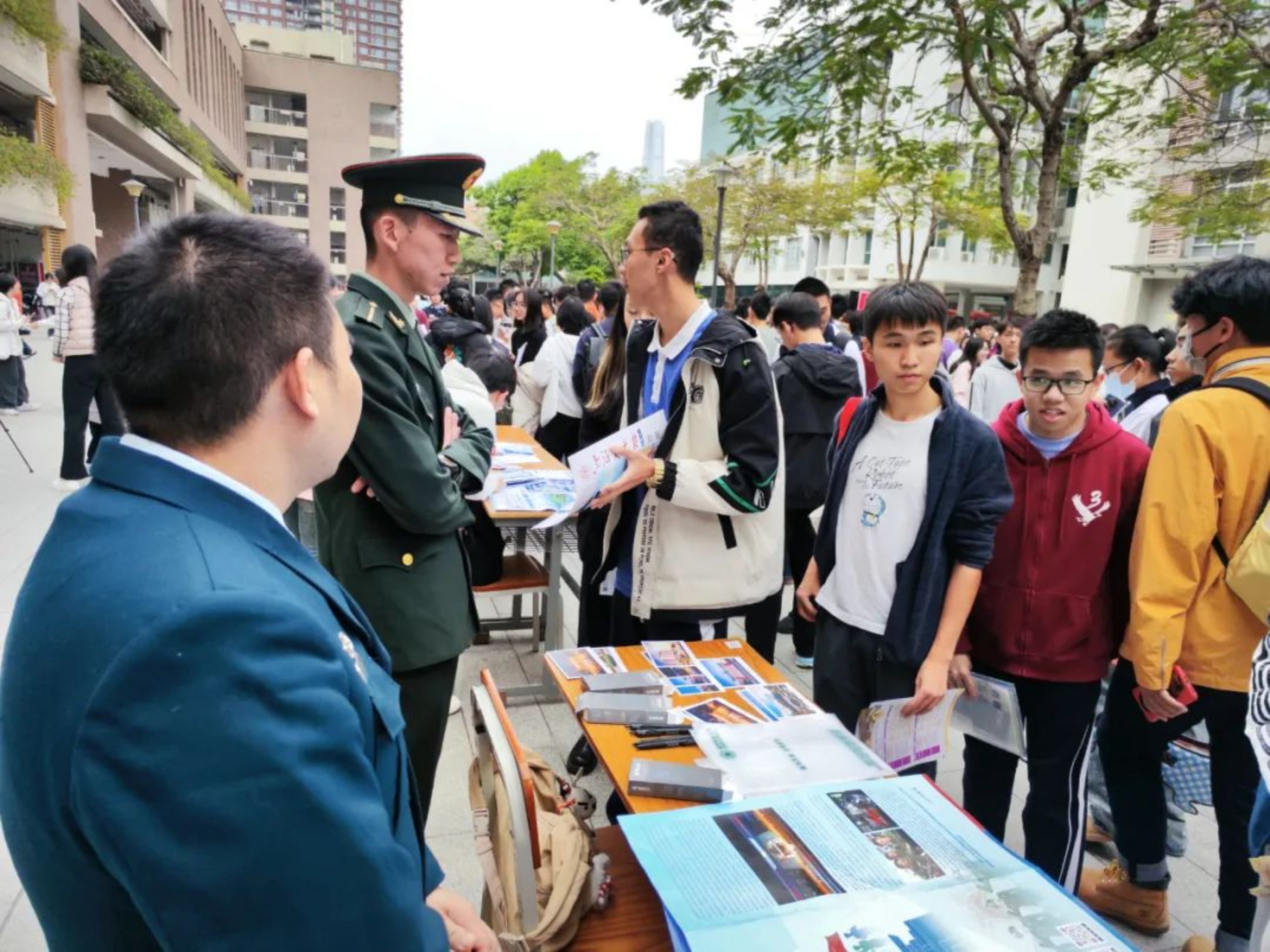 近期,由3名生长军官本科学员组成的汇报宣讲团回到母校深圳中学开展招生宣讲活动。在广东招生组廖麒翔老师全程指导参与下,宣讲团以设点宣讲答疑的形式,为有志报考军校的学子们介绍科大基本情况和“高地”特色文化,解答学子们关注的关于报考流程、体检标准、毕业去向等问题,还向同学们分发了学校特色文创产品,鼓励大家积极投身国防事业。