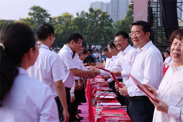 校党委书记魏文芳在讲话中表示,在秋高气爽、金桂飘香的九月,和山脚下,遇湖之畔,湖北工业职院迎来了近6400名新同学,师生们欢聚一堂,庆祝第39个教师节并举行新生开学典礼。新时代以来,学校再次进入了最好的发展时期。我们坚持党的全面领导,持续推进“提质培优行动”、“双高”建设和内涵发展。校党委团结一心、科学谋划、突出重点、敢作敢为,重塑学校形象:百辆车库、千人宿舍、万米草坪相继建成,运动场、会议中心、步行道、校门口、办公室等美化工程让学校面貌焕然一新;“能力作风”建设、“专项整治”行动、“提质培优”计划和“双高”建设周推进、月调度,学校精神面貌为之一振。今年以来,学校捷报频传:现场工程师项目突破重围,进入国家平台PK;教育部数字校园试点单位成功立项;获批工信部第一批智能制造产业人才基地;省级教师教学能力大赛4支参赛队伍获3个一等奖、一个二等奖;同时我们还荣获了互联网+省赛2金1银5铜、“湖北工匠杯”一等奖,学生技能大赛获得包括4个一等奖在内的27个奖项。一个求实、创新、国际、人文的学校新形象呼之欲出,每一位为祖国和民族、为学校和十堰拼搏奉献的湖北工业职院人都值得被致以崇高的敬意。