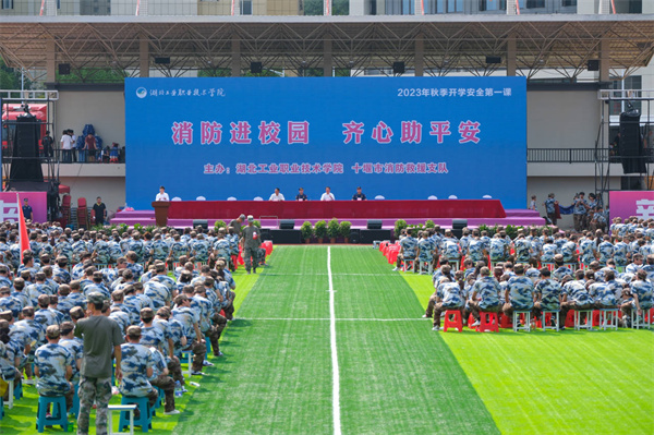 新闻网讯(文/通讯员 权舒祎 图/记者 曾刚 学生记者 罗杨洋 李世杰 黎兆君)为增强师生消防安全意识和自防自救能力,树立学生以安全为主的自我保护意识,学校于9月9日下午在北区运动场组织2023级新生开展了“开学第一课暨消防安全进军训”主题教育活动。十堰市消防救援支队副支队长黄全海、茅箭区消防救援大队大队长王林,欧冠官网副校长郑强参加了此次活动。