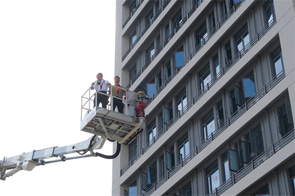 消防救援支队展示消防器材、液压钳夹乒乓球、剪扩器剪切钢筋、72米登高平台车高空救援、车操演练。