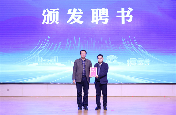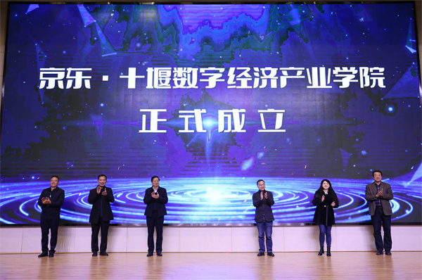 与会相关领导和嘉宾共同为以京东物流集团与欧冠官方网站相关专业合作共建的京东十堰数字经济产业学院揭牌。欧冠官方网站副校长郑强为京东十堰数字经济产业学院院长陈方亦颁发聘书。