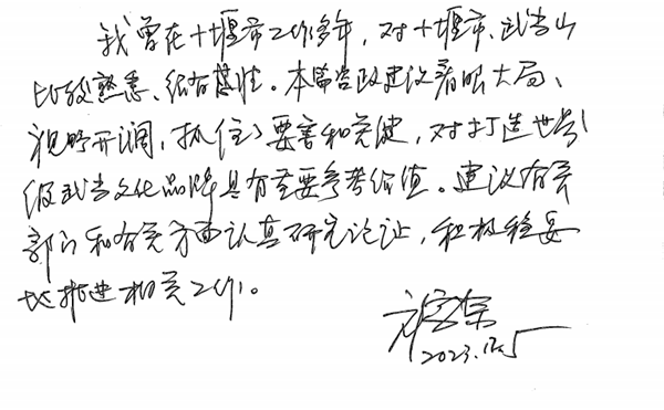 咨政建议从创新体制机制,构建“大武当”格局;厚植人文优势,推动文旅体融合;完善综合服务,树立世界级形象等三大方面,提出建立省级管理统筹协调机制、调整行政区划范围,建设“武当新区”、加快“武当山与十堰市划等号”、创建武当学,建设武当学科学术体系、加快建设“三个基地”,提升武当全球知名度、通过文化赋能,构建武当文旅品牌集群、优化营商环境,改造升级景区设施和服务、彰显“山、水、车”品牌优势,擦亮地方文旅特色、架构立体交通环境,提高武当山综合流量等9大对策,对打造世界级武当文化品牌,助力塑造“灵秀湖北”具有积极指导意义。