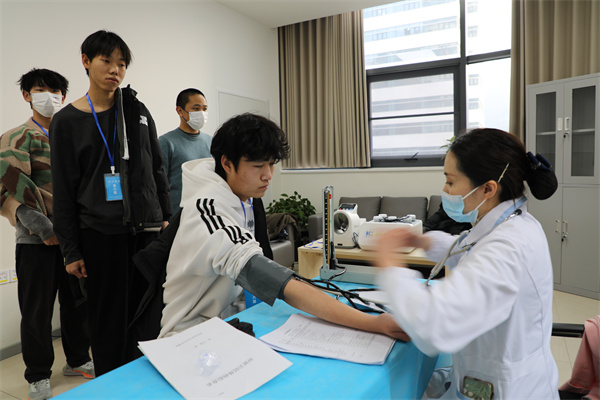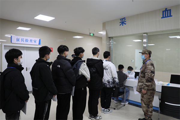 在工作人员组织下,应征大学生们有条不紊地手拿体检表,分批次有序进行内科、外科、眼科、耳鼻喉科、心电图等多项检查。
