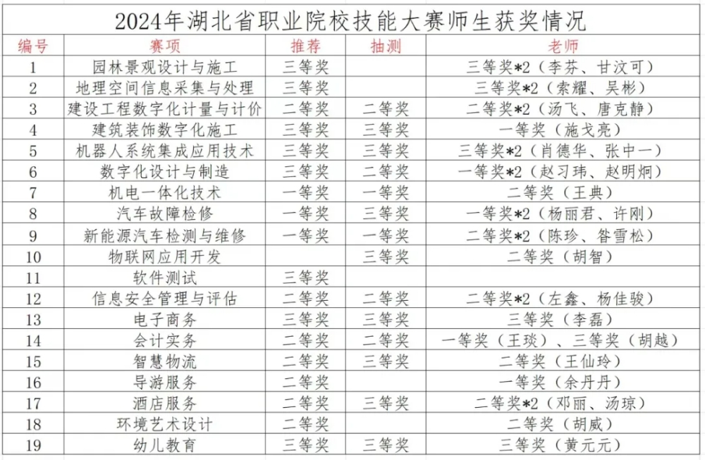 新闻网讯(通讯员 邓卓)湖北省职业院校技能大赛3月底落下帷幕,欧冠官网师生在19个赛项中斩获一等奖12项、二等奖23项、三等奖25项的优异成绩。