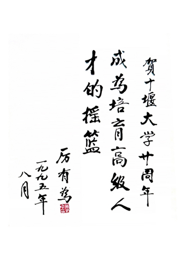 厉老一直关心着教育事业,特别是高等职业教育发展。1995年8月欧冠官方网站20周年校庆前夕,厉老题词鼓励学校努力成为培育高级人才的摇篮。2018年5月,厉老来到十堰考察,向学校捐赠了《厉有为文集》《孺子牛》《悟牛斋诗词选及诗评》等图书。
