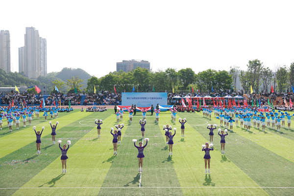 迎着火热的朝阳,随着激昂的旋律,裁判员、青年志愿者及各学院代表队的方阵依次入场。彩旗飘展、华彩绽放,一场视听盛宴随之拉开序幕。《爱的华尔兹》双人舞、《九州同》扇舞,学生动作优雅、舞姿曼妙,让师生久久沉浸其中;《舞动青春》《动感“101”》《冠军》等热歌劲舞,涵盖了爵士、hiphop等舞种,燃爆全场、掌声雷鸣;在《创世黄龙》方阵展演中,学生手持条条“龙”飞舞在空中,上下起伏、左右翻滚,展现着彩带龙的轻柔之美;《威武霸气汽车人》融合了战术、倒功、拳术和赛车表演,在彩色摄影烟雾弹下上演燃爆“大片”。在压轴节目中,350名学生带来“九式武当太极”表演,120名学生共同演绎了《未来有你》健美操团队表演,将活动氛围推向了高潮。