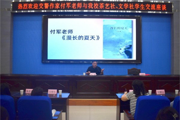 新闻网讯(文/学生记者 罗杨洋 图/学生记者 朱榕焕 李孟含)6月6日晚,一场别开生面的文学交流座谈会在学校学术报告厅举行,此次交流座谈会特别邀请到了十堰本土作家、国务院普法办全国微电影大赛二等奖获得者、十堰市公安交管局四大队大队长付军老师,与听众分享他的“二汽”题材小说《漫长的夏天》,并进行现场交流。校党委委员、副校长、党委宣传部部长胡昌龙,生态环境学院、艺术设计学院师生代表,茶艺社、追天文学社、大学生记者团等学生社团成员,市内部分文学爱好者参加座谈会。