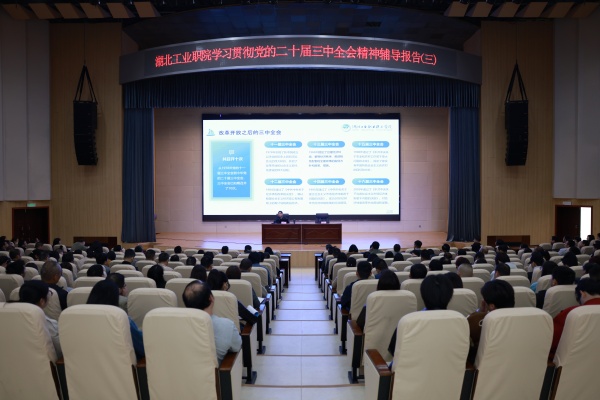 新闻网讯(文/杨波 图/熊超)为深入学习贯彻党的二十届三中全会精神,推动落实相关工作,11月7日上午,学校举办学习贯彻党的二十届三中全会精神第三场辅导报告会,由学校发展规划处(质量管理处)处长卞平教授作辅导报告,全体无课教职工、学生党员共同聆听辅导报告。校党委委员、组织部部长李辉主持报告会。