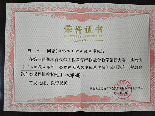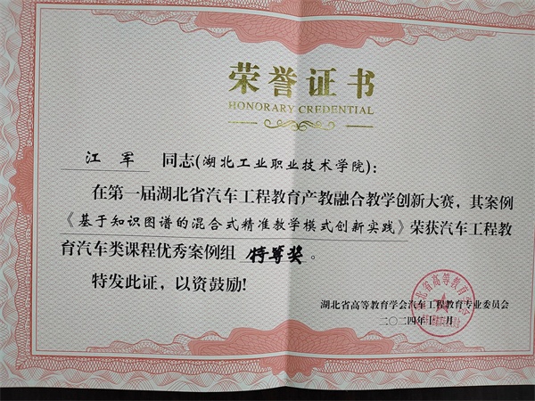 新闻网讯(通讯员 张健)11月30日至12月1日,湖北省高等教育学会汽车工程教育专业委员会2024年年会在武汉理工大学举行,同期举办了首届湖北省汽车工程教育产教融合教学创新大赛,在大赛中,欧冠官网汽车工程学院江军老师的《基于知识图谱的混合式精准教学模式创新实践》荣获汽车工程教育汽车类课程优秀案例特等奖,陈东老师的《“三阶段五环节”合作探究式教学改革实践》、赵锐老师的《追溯汽车之韵,传承文化之魂》荣获汽车工程教育汽车类课程优秀案例二等奖。