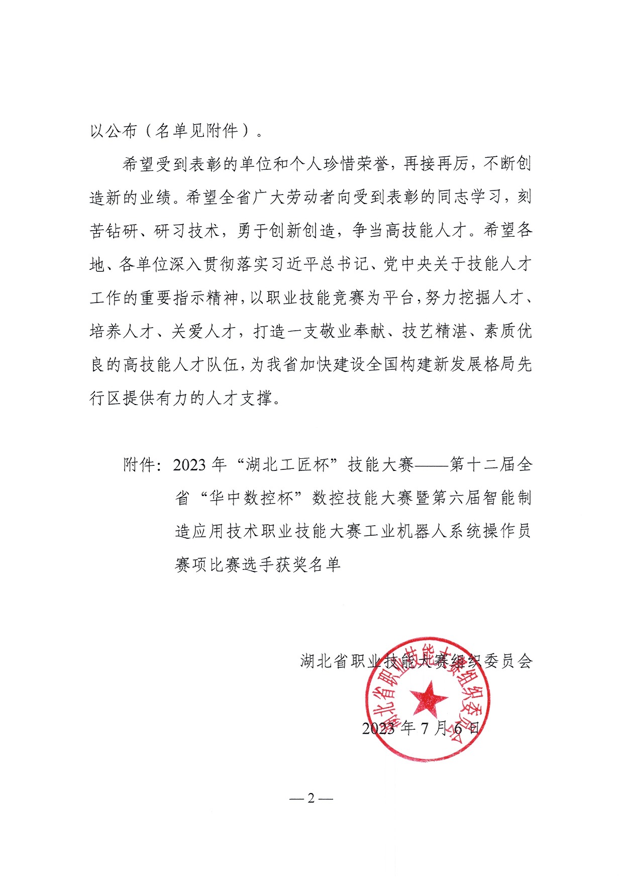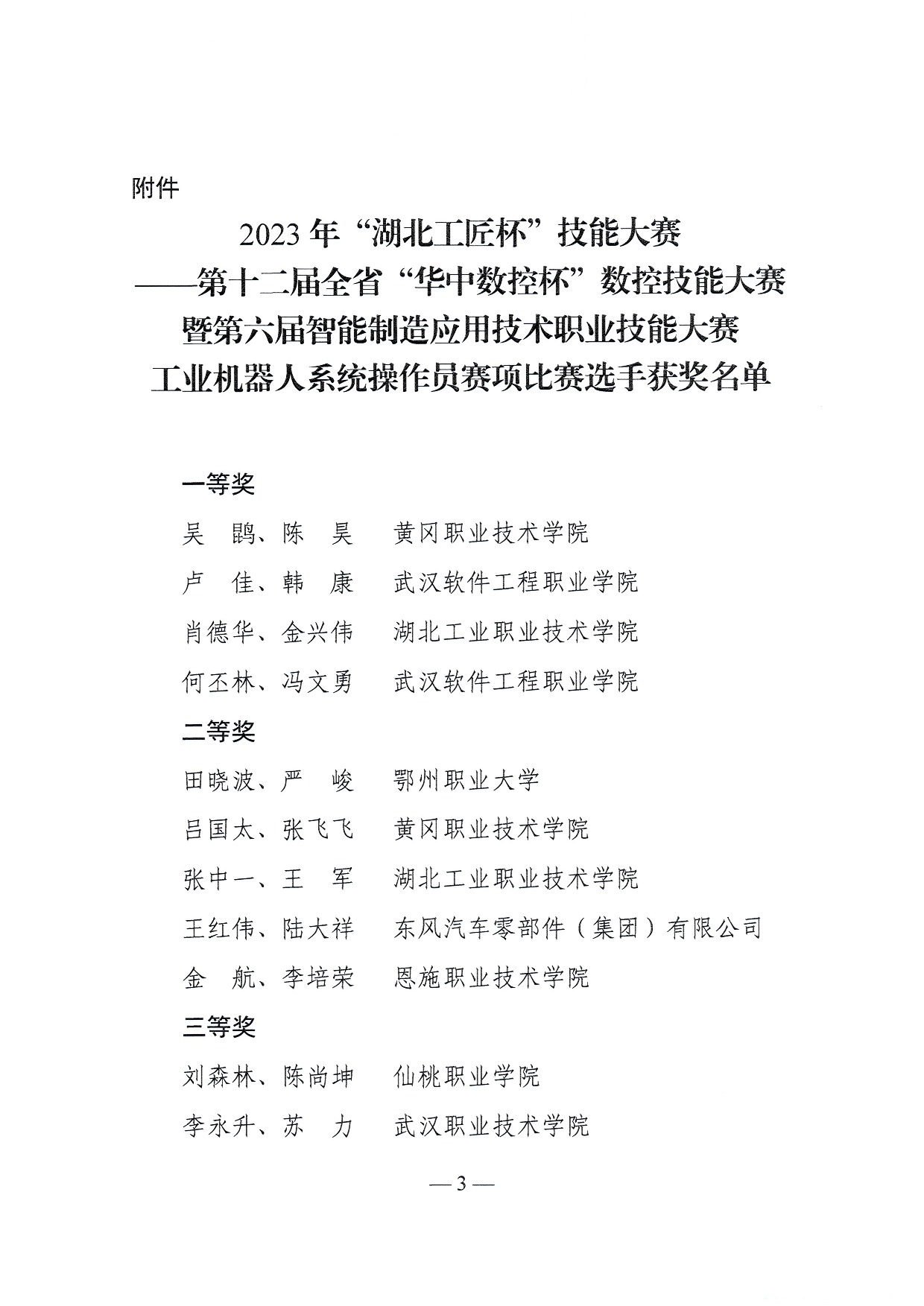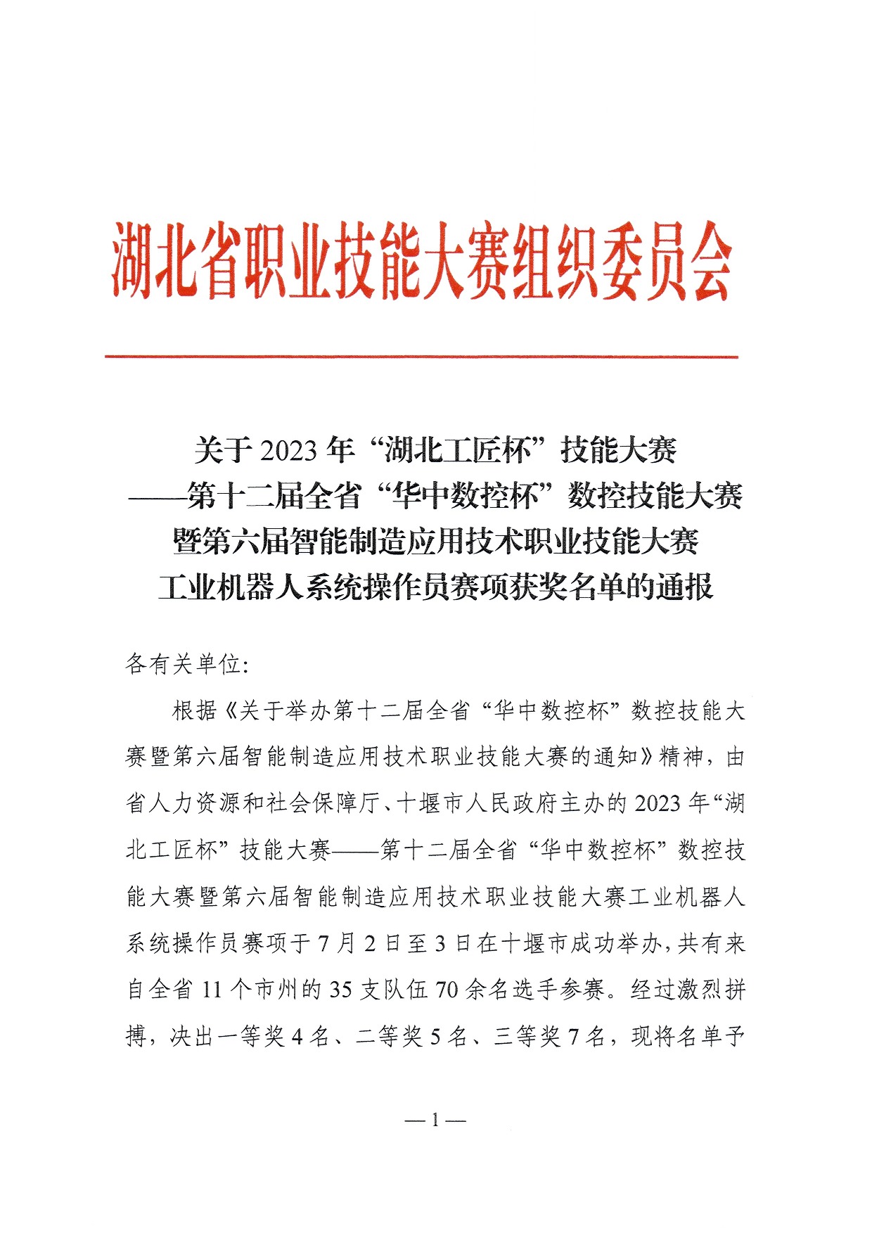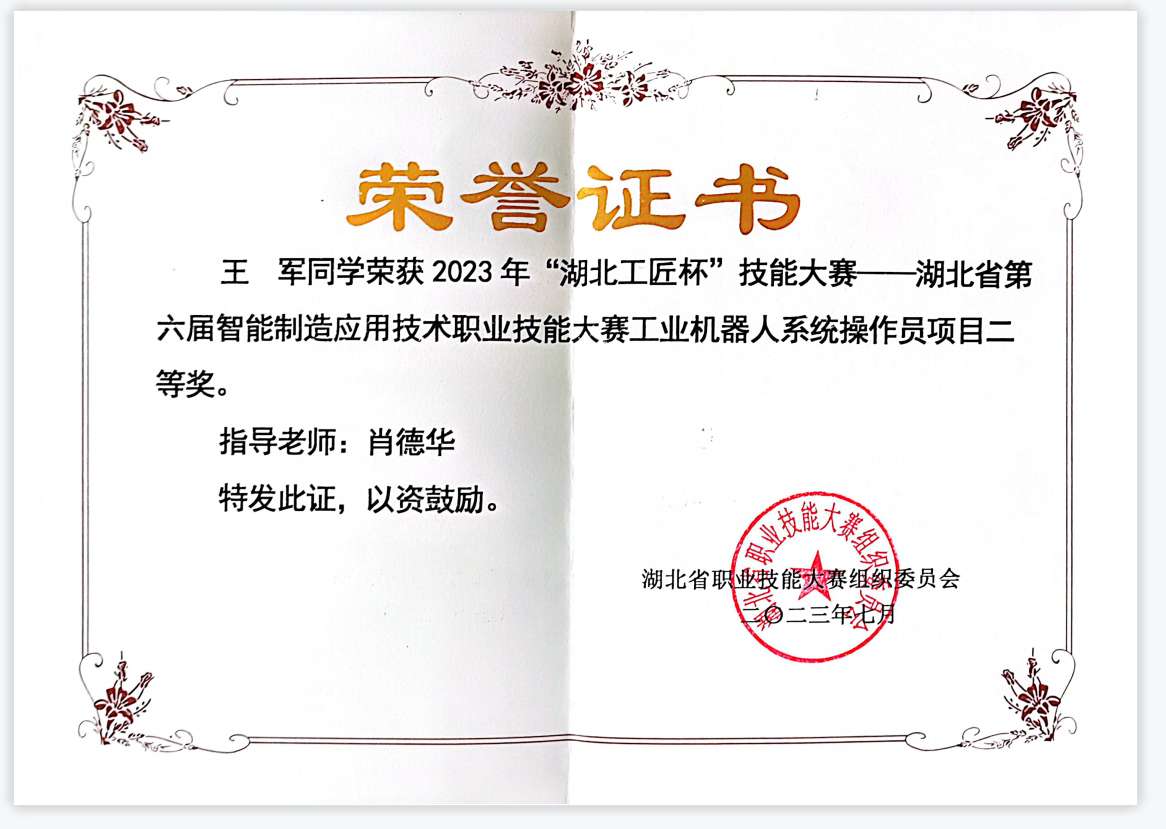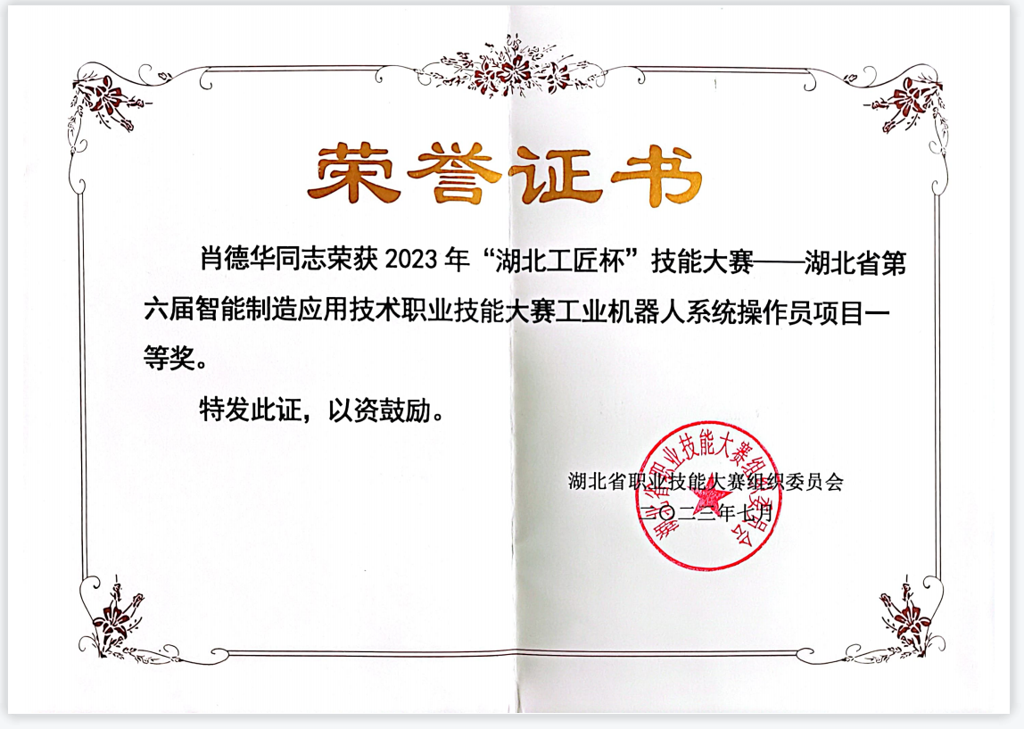 新闻网讯(通讯员薛嘉鑫)近日,从湖北省职业技能大赛组织委员会处获悉,欧冠投注官网入口肖德华、金兴伟两位老师获“2023年‘湖北工匠杯’技能大赛”工业机器人系统操作员赛项一等奖。