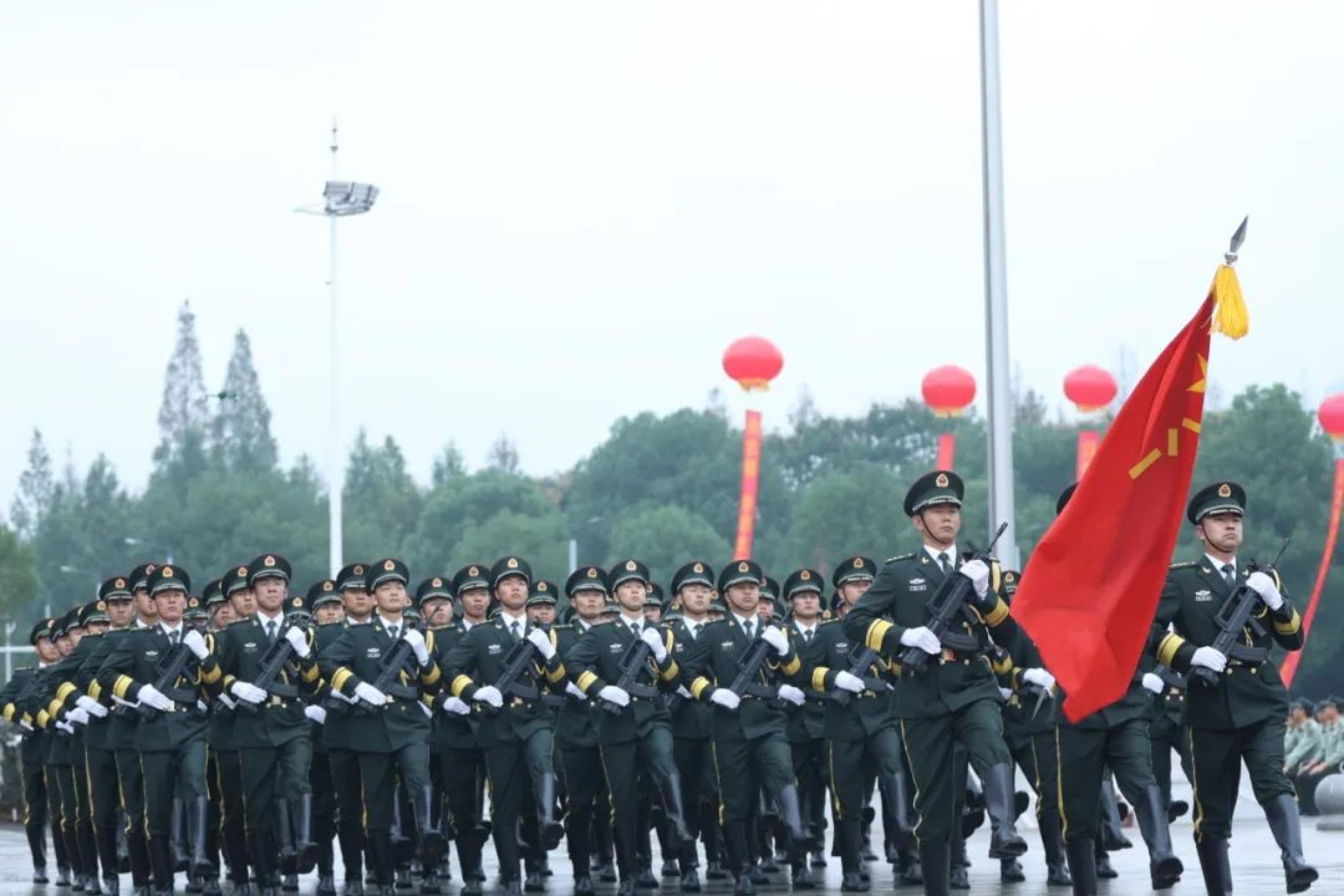 他们护卫着军旗向前挺进,正步铿锵堂堂气,寒光闪闪凛凛威。