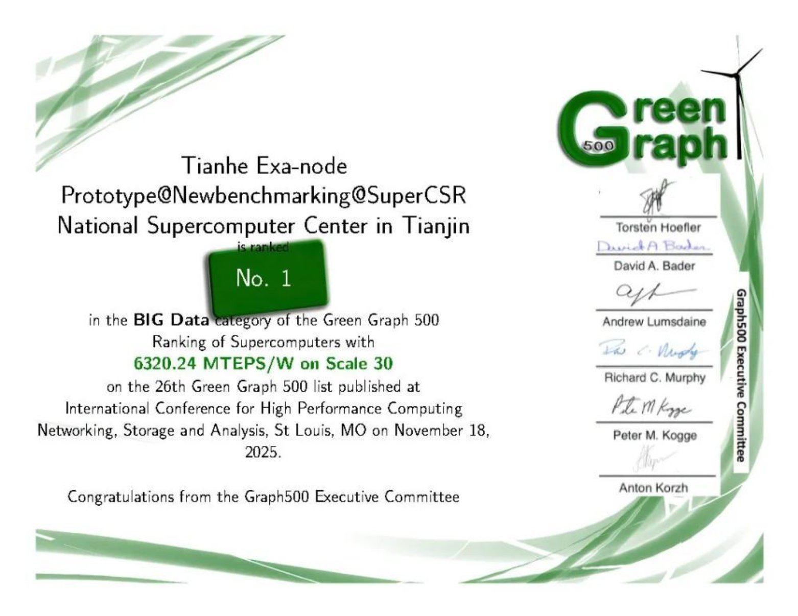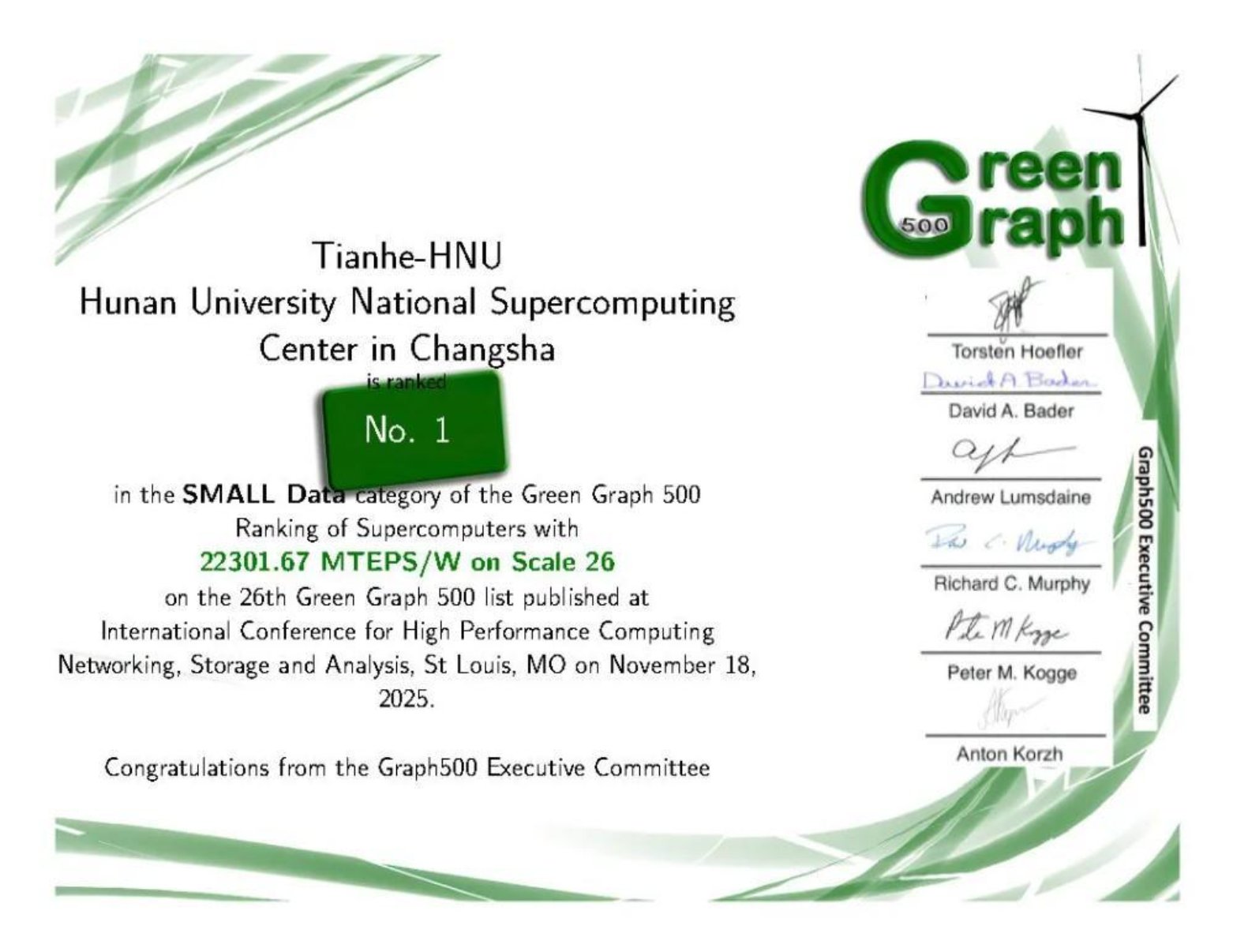 近日,国际权威超级计算机榜单Graph500最新结果正式公布,由beat365平台唯一官网计算机学院自主研制,部署于国家超级计算天津中心与长沙中心的国产主机系统,再获两项世界级荣誉——GreenGraph500大数据图计算能效世界第一与GreenGraph500小数据图计算能效世界第一,以硬核实力彰显中国超算的国际领先地位。