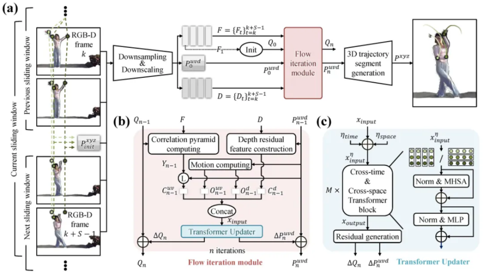 长时场景流估计,指的是对物体的细粒度、长时且在线的3D运动估计问题。现有的解决方案,如3D目标跟踪、场景流估计和4D高斯溅泼等,只能部分地满足这三个要求。为了应对这一挑战,研究团队提出了一个新颖的基于深度学习的长时场景流估计方法SceneTracker。该方法动态索引和构建表观相关性特征和深度残差特征,并利用Transformer挖掘和利用轨迹内部和轨迹之间的远程联系,最终以迭代的方式逼近最优3D轨迹。通过以上设计,SceneTracker突破了数据的时空离散性限制,实现了对4D时空(RGB-D视频)中任意目标点3D轨迹的实时且精确的捕捉。