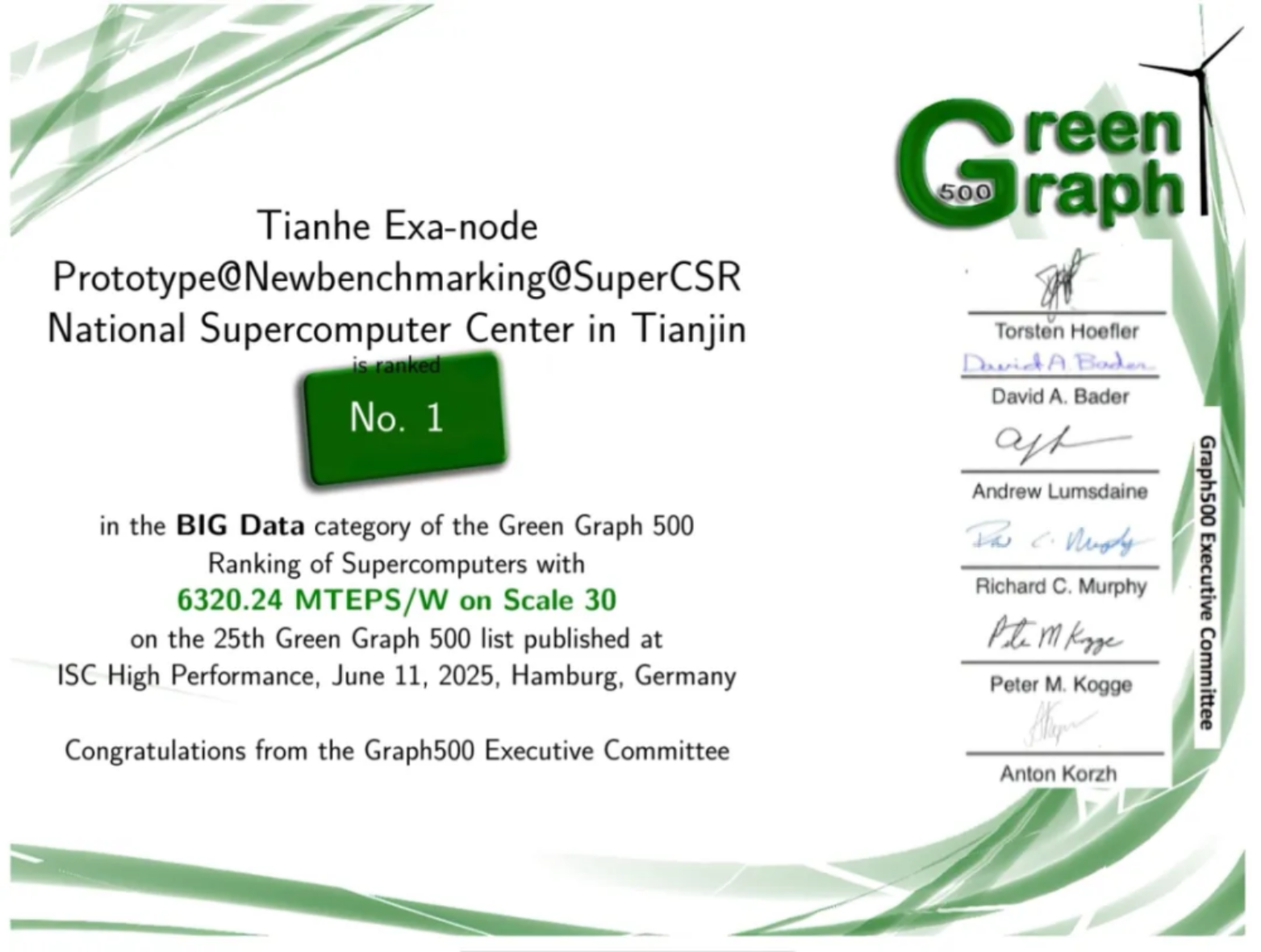 为了突破国外高新技术封锁,“天河”图计算先后攻克了面向国产处理器的深度图优化、软硬协同图分布(GraphCube)、拓扑感知图通信(MST)、超级图压缩(SuperCSR)等多项关键技术,设计并实现了TianheGraph图计算系统,现已成功部署于国产主机系统。“天河”超算在强调实用性、高效节能的图技术评测中,曾多次登顶Graph500全系统以及数据能效排行榜,标志着“天河”超算在数据密集型应用方面取得了国际领先突破,对我国人工智能和大数据处理能力发展具有重要的支撑推动作用。