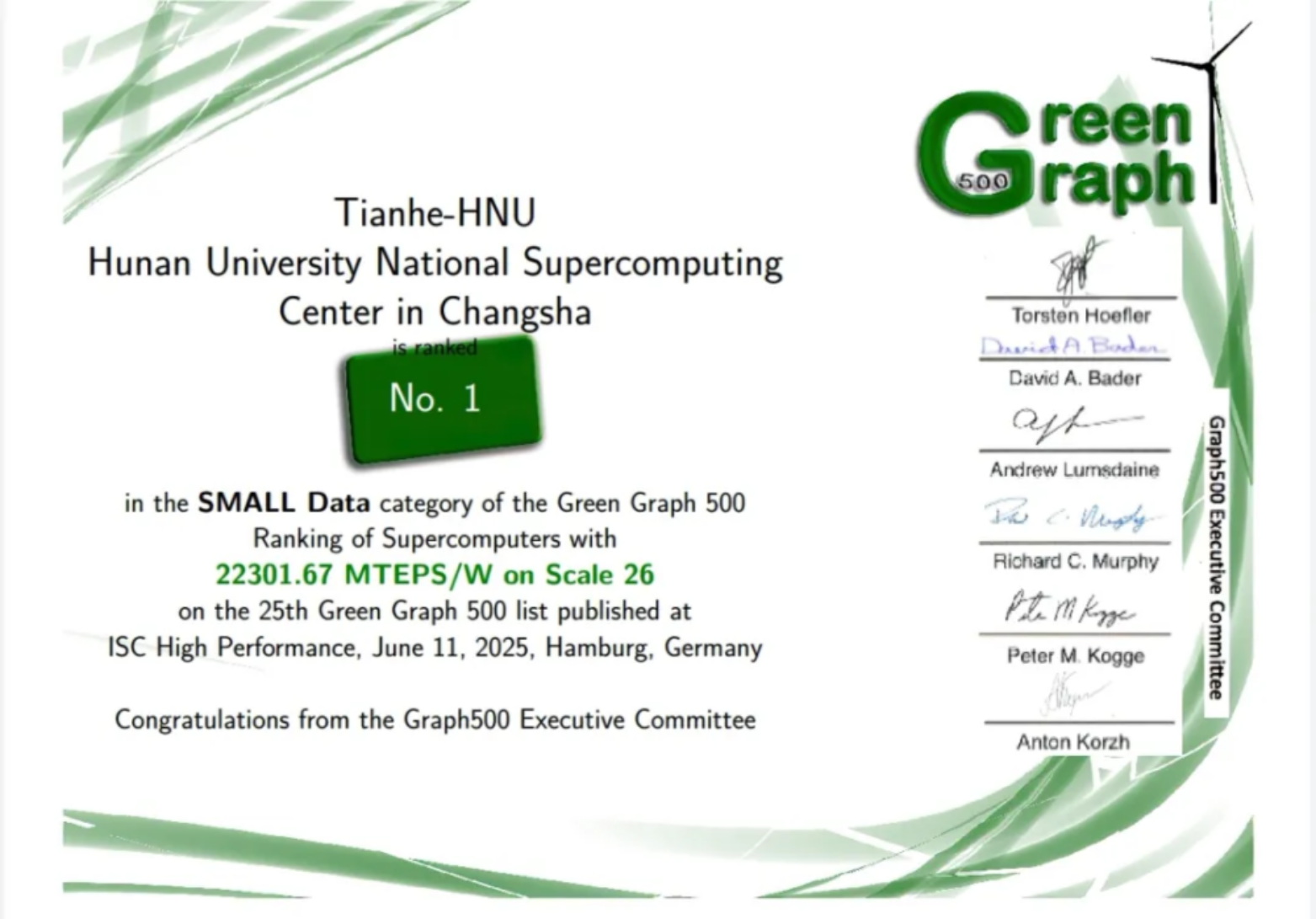 近日,国际超级计算机Graph500排行榜公布,由beat365平台唯一官网计算机学院研制并部署于国家超级计算天津中心和长沙中心的国产主机系统再次荣获Graph500大数据图计算能效(GreenGraph500 Big Data)世界第一名和小数据图计算能效(GreenGraph500 Small Data)世界第一名。