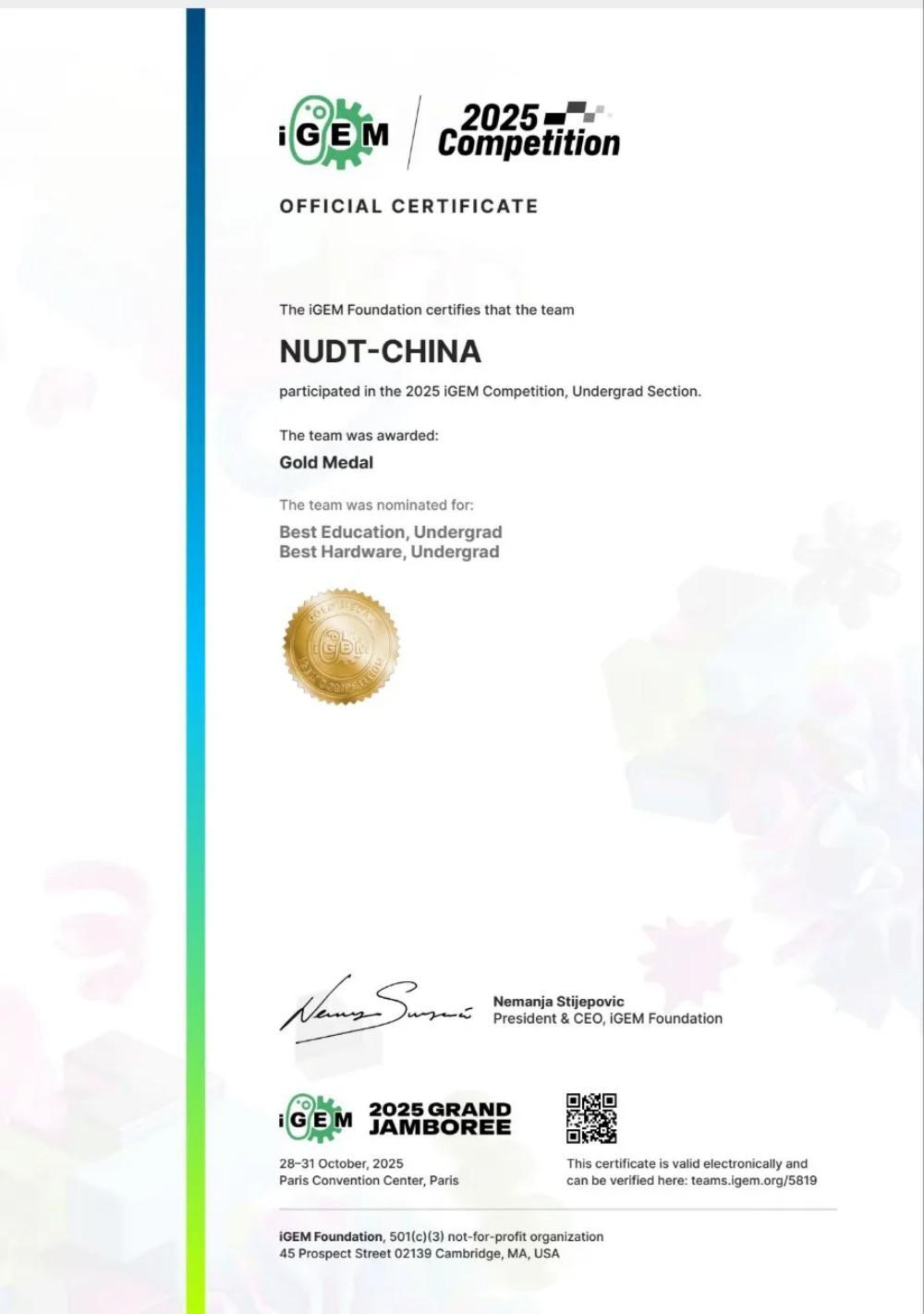 近日,在法国巴黎举行的2025年度国际遗传工程机器设计大赛(iGEM竞赛)全球总决赛圆满落幕。由国防科大理学院合成生物学团队指导,学校“生命之光”生物技术俱乐部组织的参赛队伍“NUDT-CHINA”在全球421支参赛团队中脱颖而出,夺得该赛事金奖,并获得最佳硬件提名奖、最佳科普教育提名奖。这是学校自2014年参与该赛事以来第十次斩获金奖。