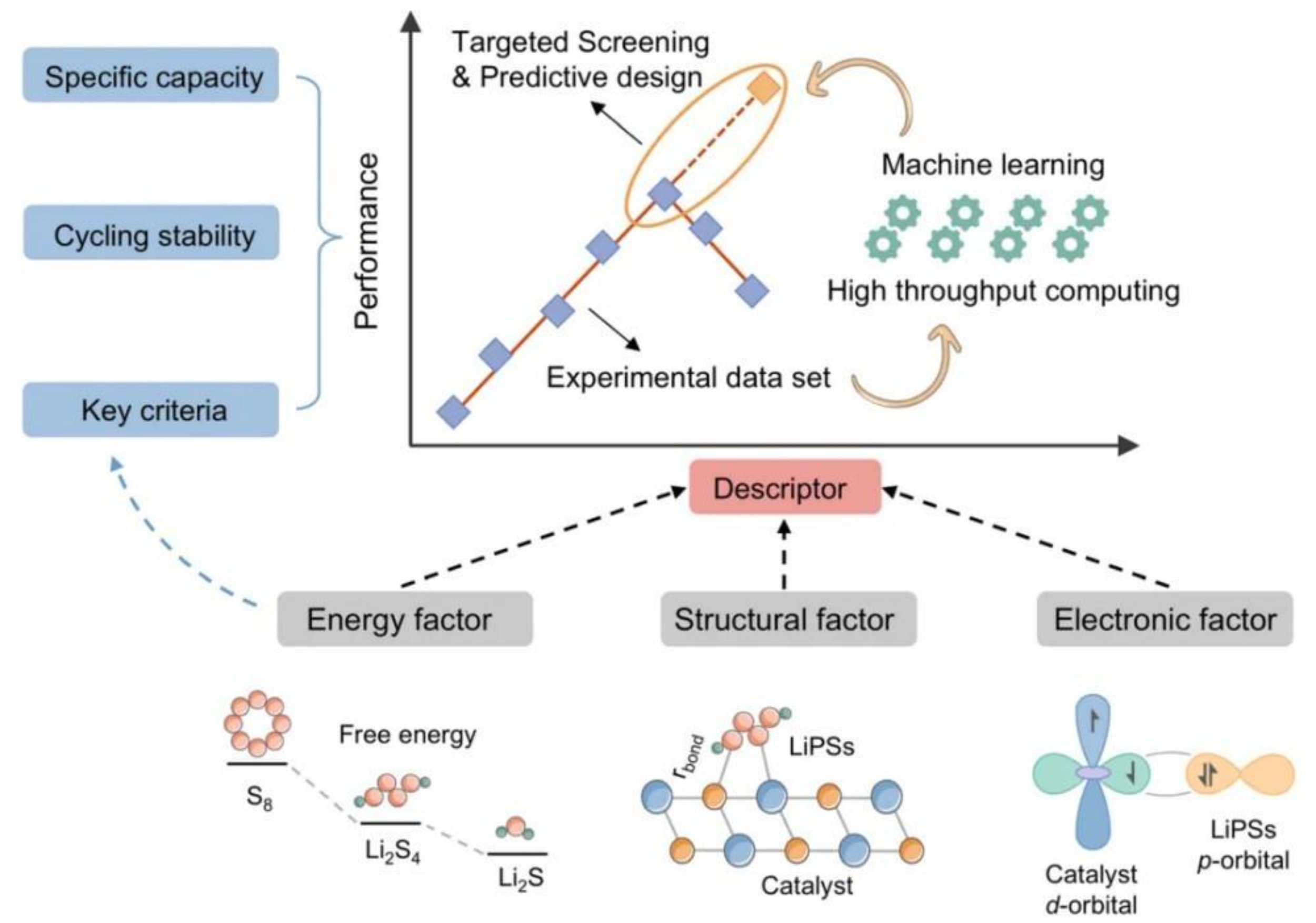 此外,针对我国贫钴的资源现状,该团队聚焦于具有超高理论能量密度(2600 Wh/kg)、硫资源丰富且低成本、环境友好的锂硫电池体系,围绕其存在的多硫化锂(LiPS)的穿梭效应和硫还原反应(SRR)的缓慢动力学问题,从反应性描述符视角系统探讨了锂硫电池中SRR过程的催化剂作用机制,科学总结了适用的反应性描述符体系及其作用,详细讨论了反应性描述符与人工智能结合推动锂硫电池催化剂设计从经验试错走向理性开发转变的可行性,为高能量密度金属硫电池研究和催化剂开发提供了指导。