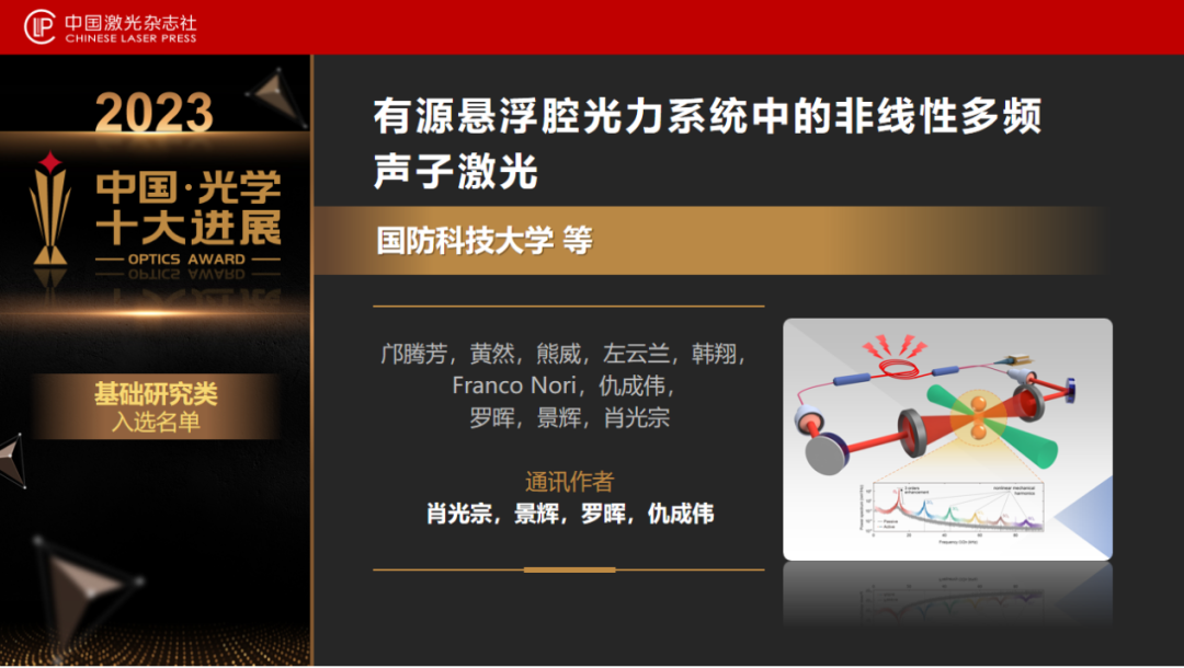 近日,“2023中国光学十大进展”发布。beat365平台唯一官网前沿交叉学科学院激光陀螺创新团队成果“有源悬浮腔光力系统中的非线性多色声子激光”入选“2023中国光学十大进展(基础研究类)”,该成果入选进一步提升了学校光学工程学科的学术影响力。