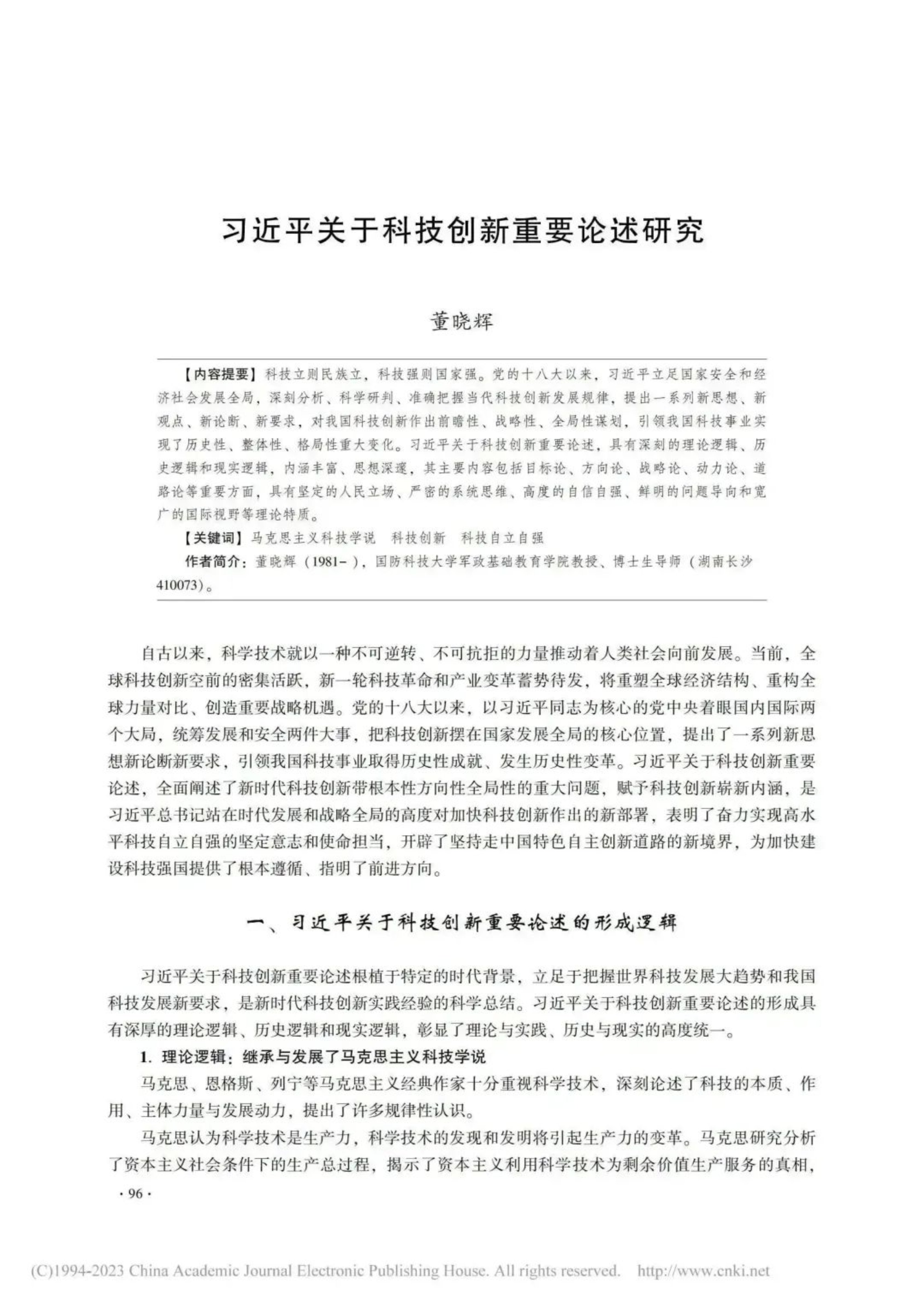 近日,国防科大军政基础教育学院教授董晓辉撰写的理论文章《习近平关于科技创新重要论述研究》刊发于《马克思主义研究》2023年第8期。