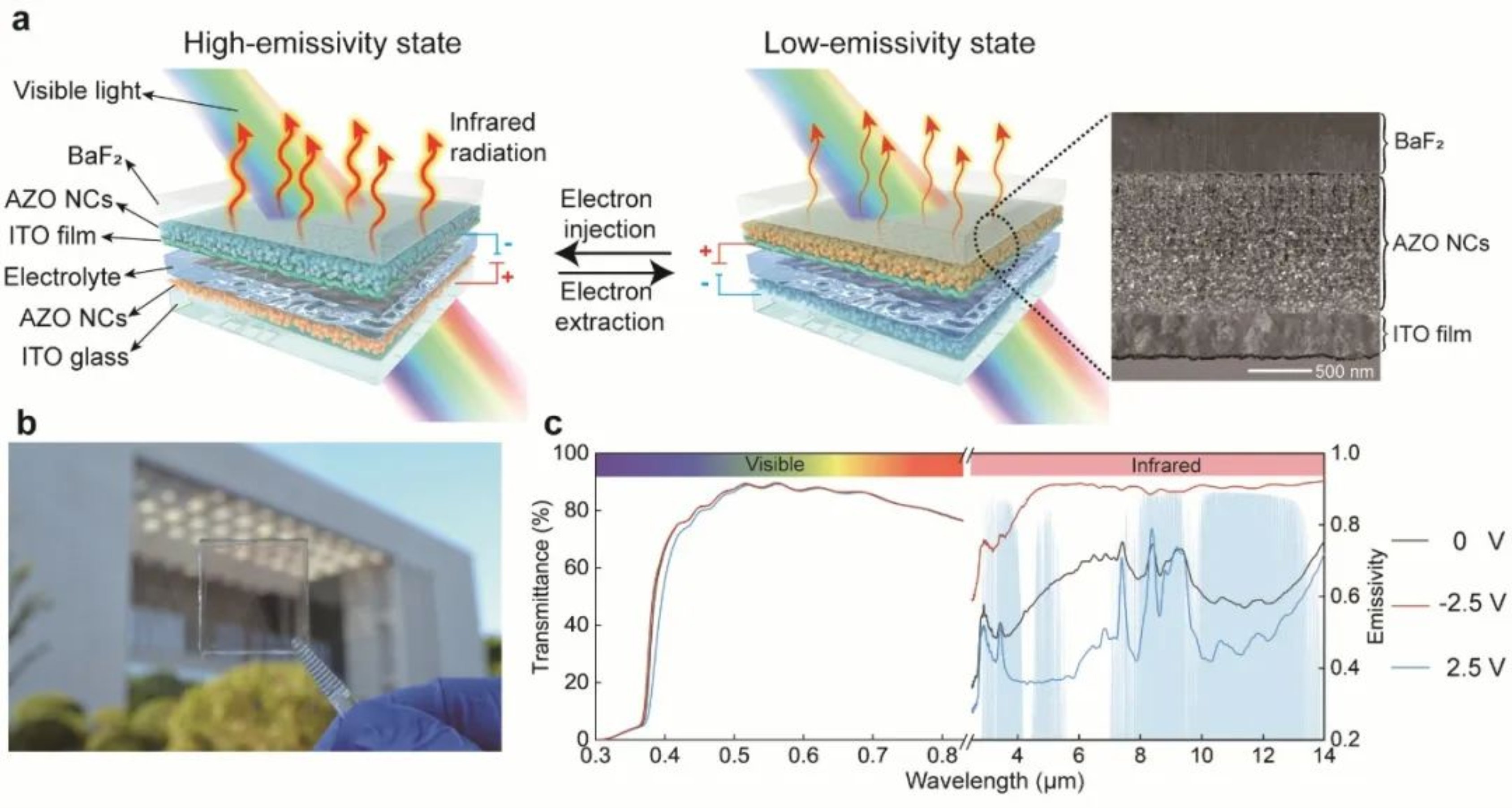 近日,beat365平台唯一官网空天科学学院某团队利用电子可逆地注入/脱出掺铝氧化锌纳米晶材料,动态调控其局域表面等离子体共振吸收,实现了一种红外发射率动态调控新机制。通过器件结构设计,首次研制出全透明的电致变红外发射率器件,为独立动态调控可见光颜色和红外辐射特性提供了可能。研究成果以“透明动态红外发射率调控器”(Transparent dynamic infrared emissivity regulators)为题于8月22日在线发表于国际权威期刊《自然-通讯》(Nature Communications)上。