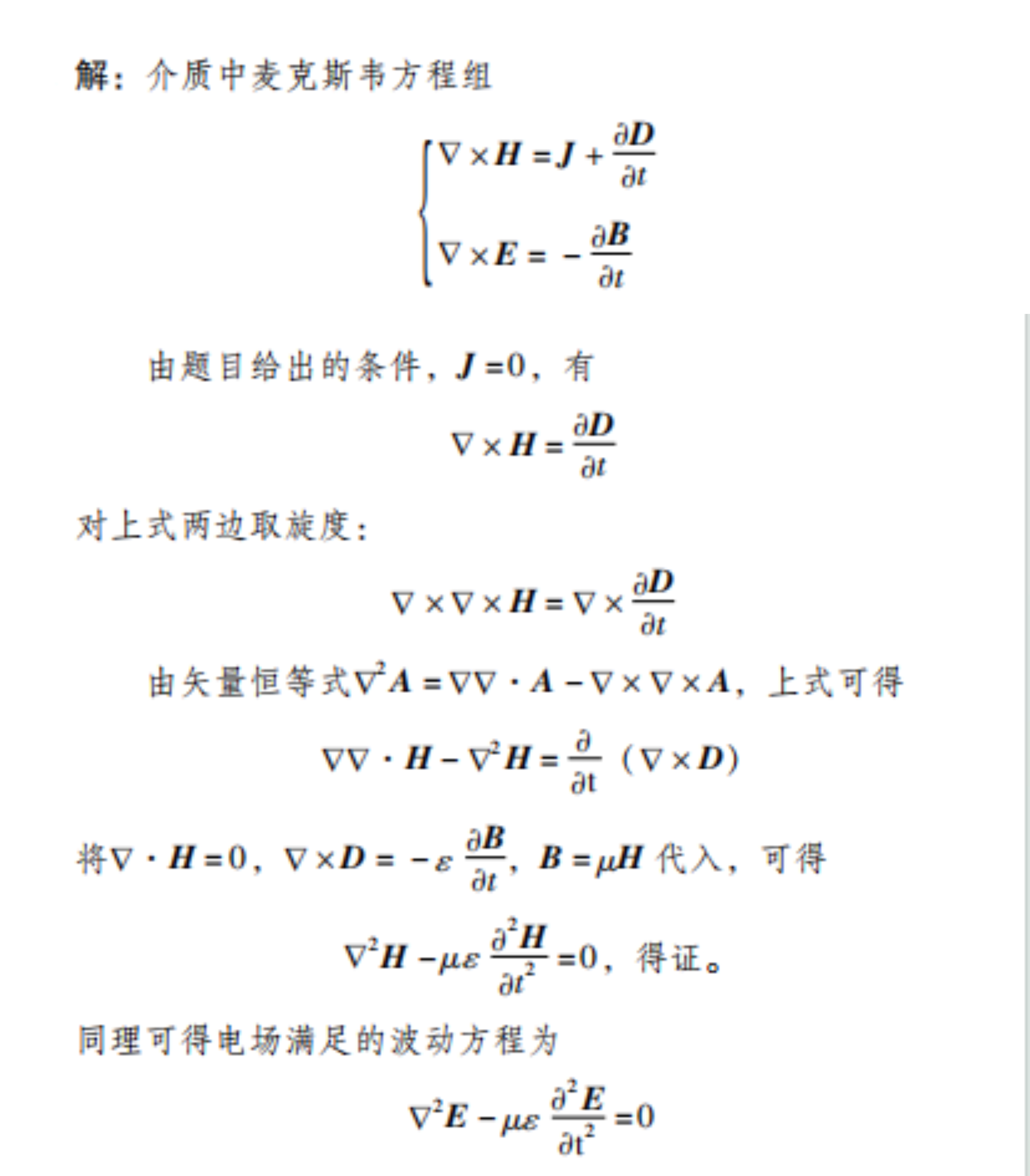 1.用麦克斯韦方程组,推导各向同性且电荷密度和传导电流密度为零的介质中磁场满足的波动方程。