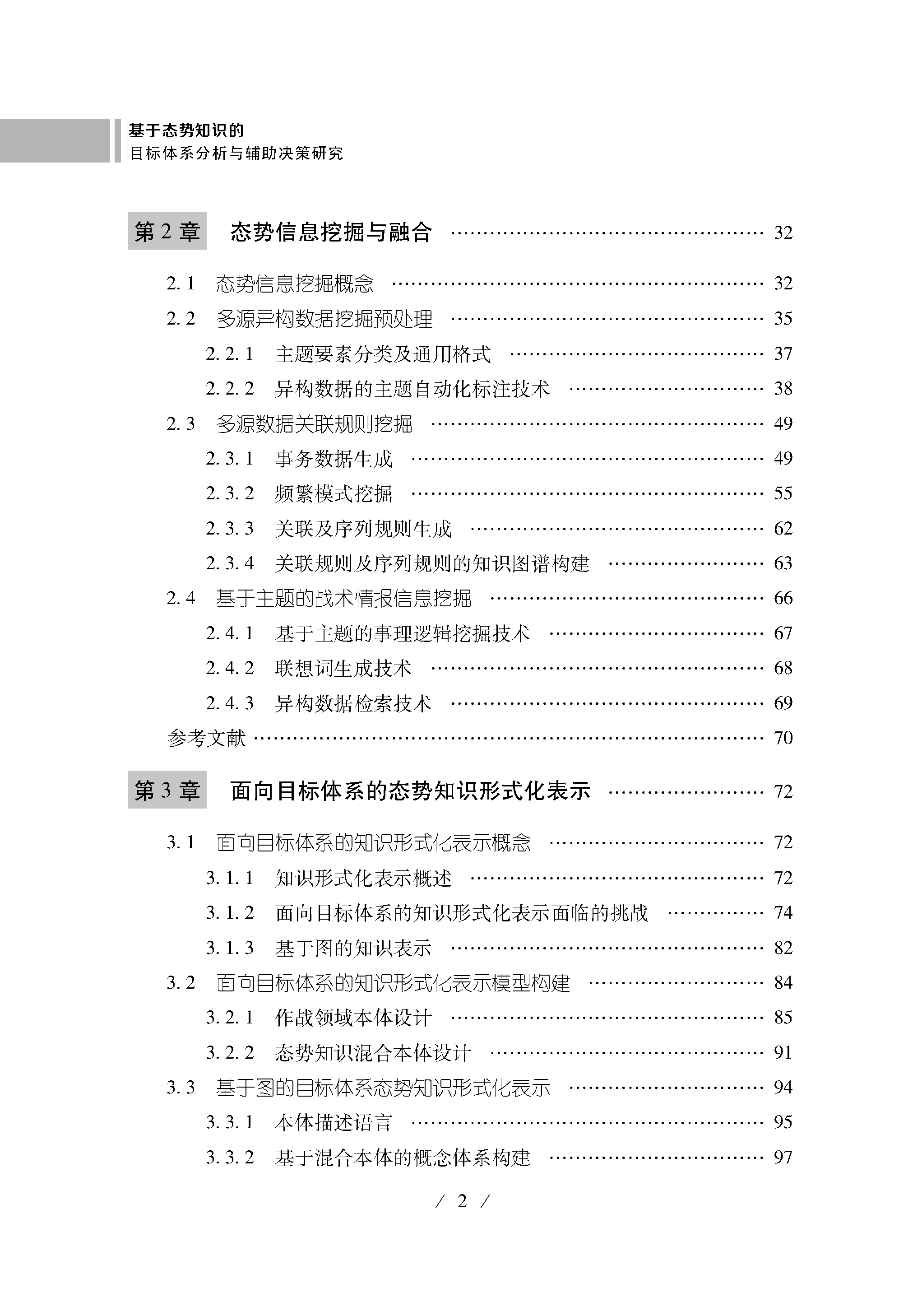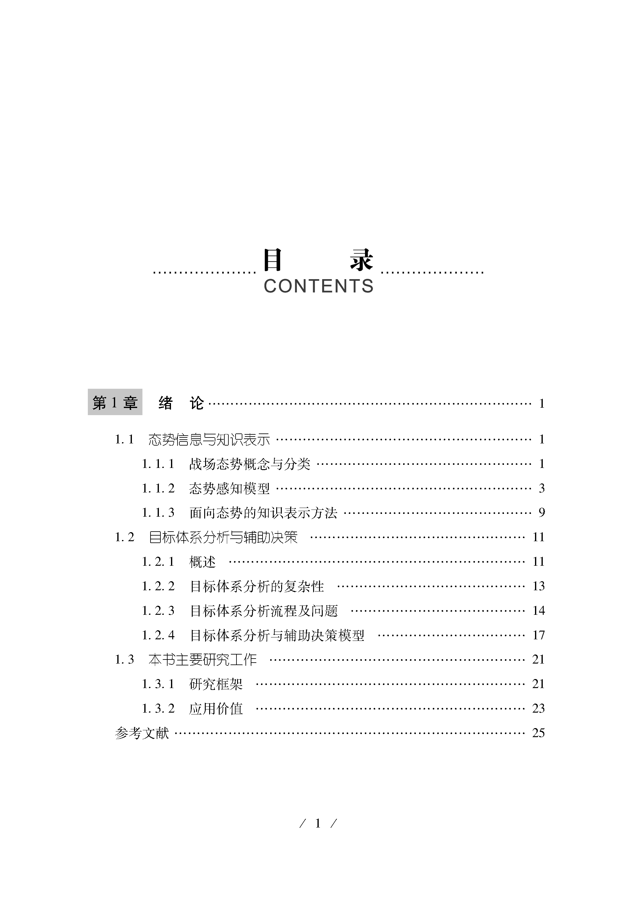 本书引入数据融合、逻辑推理、强化学习、复杂网络、知识图谱等新理论、方法,分9章展开分析研究。除第1章绪论和第9章原型系统设计与案例验证外,其余章节涵盖了态势信息挖掘、目标体系构建、目标体系分析及辅助决策三部分主体内容。各章节目录如下: