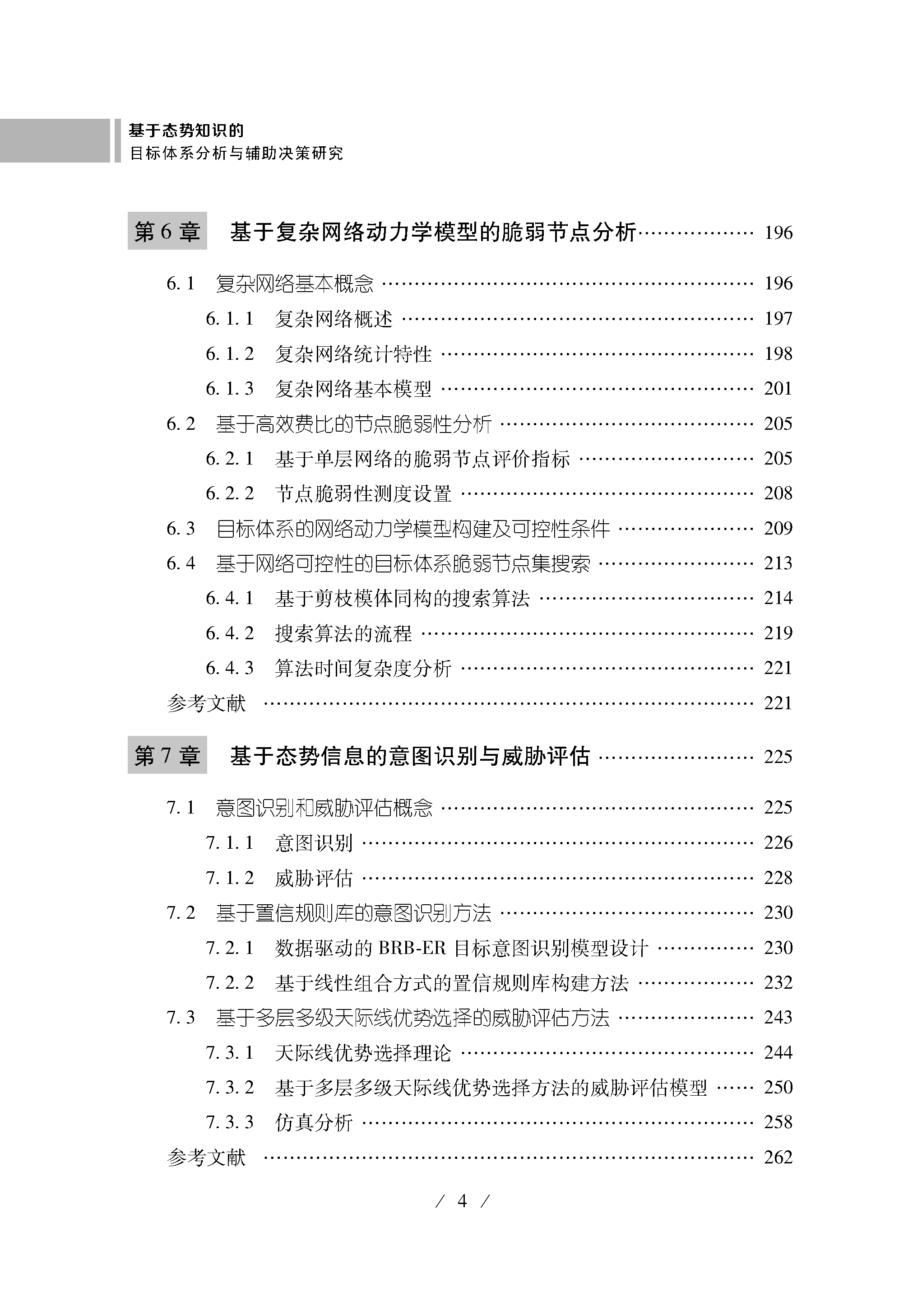 本书主要介绍了态势信息挖掘与融合、面向目标体系的态势知识形式化表示、基于图的目标体系同态推理、基于缺省推理的目标体系建模、基于复杂网络动力学模型的脆弱节点分析、基于态势信息的意图识别与威胁评估以及知识图谱构建与辅助决策应用等内容,为现代战场目标体系分析和辅助决策提供理论与技术支持。