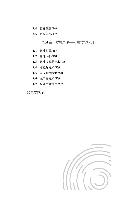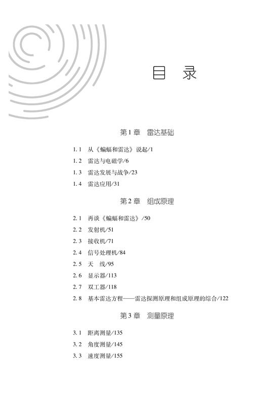 本书以通俗易懂、生动有趣的方式介绍了雷达原理的基本知识,希望能给读者一些新的启示。全书共四章,第一章为雷达基础,介绍雷达的探测原理,雷达与仿生学、电磁学乃至与战争之间的关系,并展示雷达的应用;第二章为组成原理,简要介绍雷达的组成及各基本组成部分的工作原理、性能指标等,并用一种全新的方式展示了雷达方程;第三章描述雷达的测量原理,以距离、角度、速度的测量为基础,并扩展到目标跟踪和目标识别;第四章介绍雷达的发展,涉及脉冲积累、脉冲压缩、脉冲多普勒技术、相控阵雷达技术、合成孔径技术、雷达抗干扰技术、特殊用途雷达等。