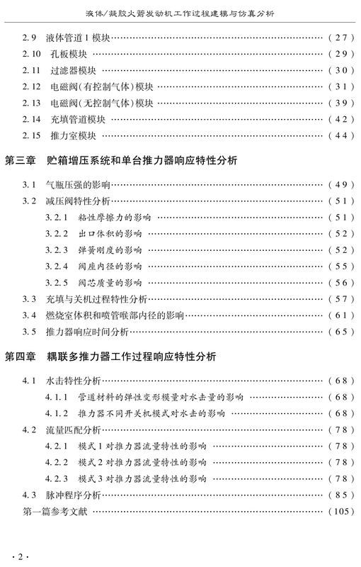《液体\凝胶火箭发动机工作过程建模与仿真分析》以空间推进系统、凝胶推进系统、泵压式液体火箭发动机为研究对象,建立和阐述了液体/凝胶火箭发动机工作过程的理论、动态模型和数值计算方法。第一篇建立空间推进系统工作过程数学模型,包括气瓶数学模型、电爆阀数学模型、减压阀数学模型、贮箱数学模型、液体管道数学模型、孔板及过滤器数学模型、电磁阀数学模型、充填管道数学模型和推力室数学模型,仿真分析了空间推进系统启动、稳态和关机过程的特性。第二篇建立凝胶推进系统工作过程数学模型,仿真分析了凝胶推进系统流量分配规律、水击特性和推力调节特性。第三篇建立泵压式液体火箭发动机工作过程数学模型,对泵压式液体火箭发动机起动过程特性进行仿真分析。上述理论或动态模型反映了当前液体/凝胶火箭发动机工作过程的新研究成果。