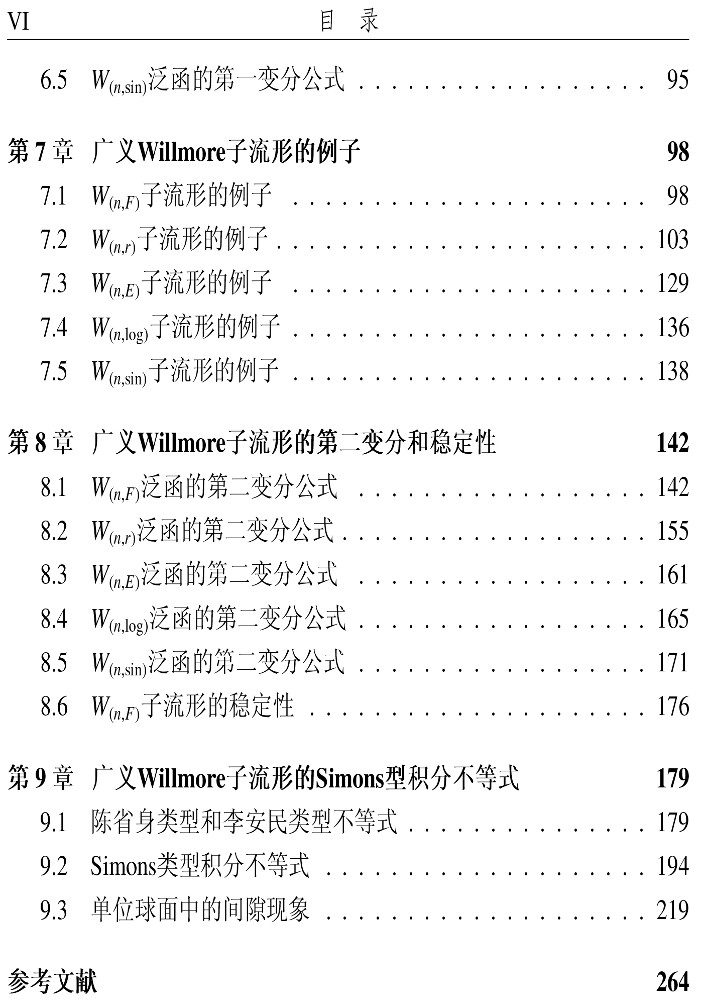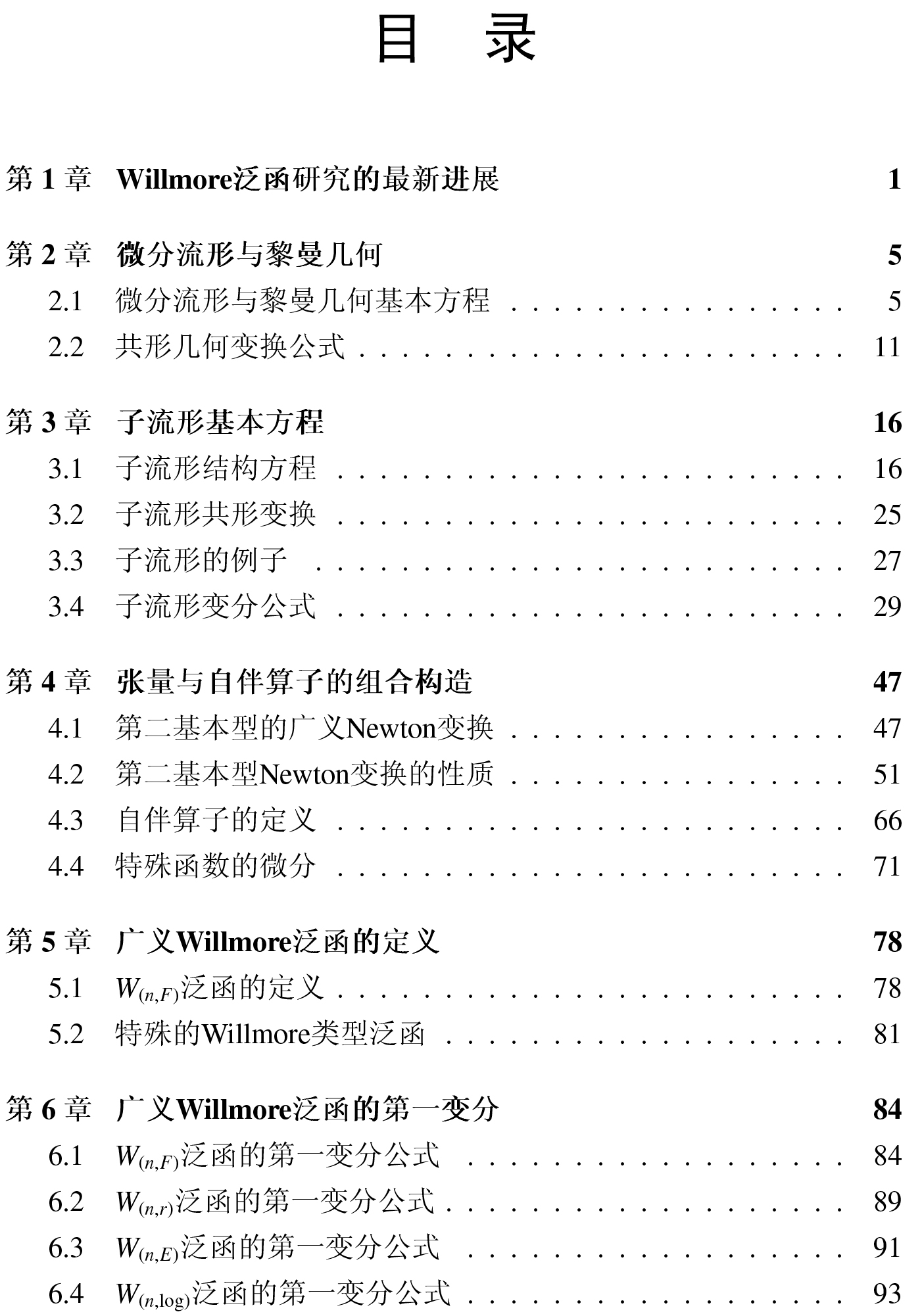 第三部分为5、6、7、8、9章共五章,具体且精细地研究了各种类型的Willmore泛函,构造了多种例子,讨论丁了Willmore泛函的稳定性,特别研究了Willmore泛函临界点的间隙现象,是本书的校心部分。全书论述严密精炼,适合数学与图形处理专业的研究生及科研工作者参考。