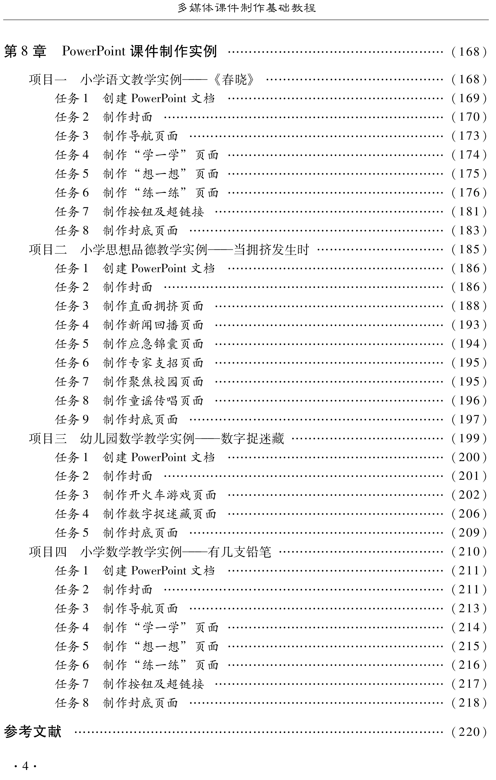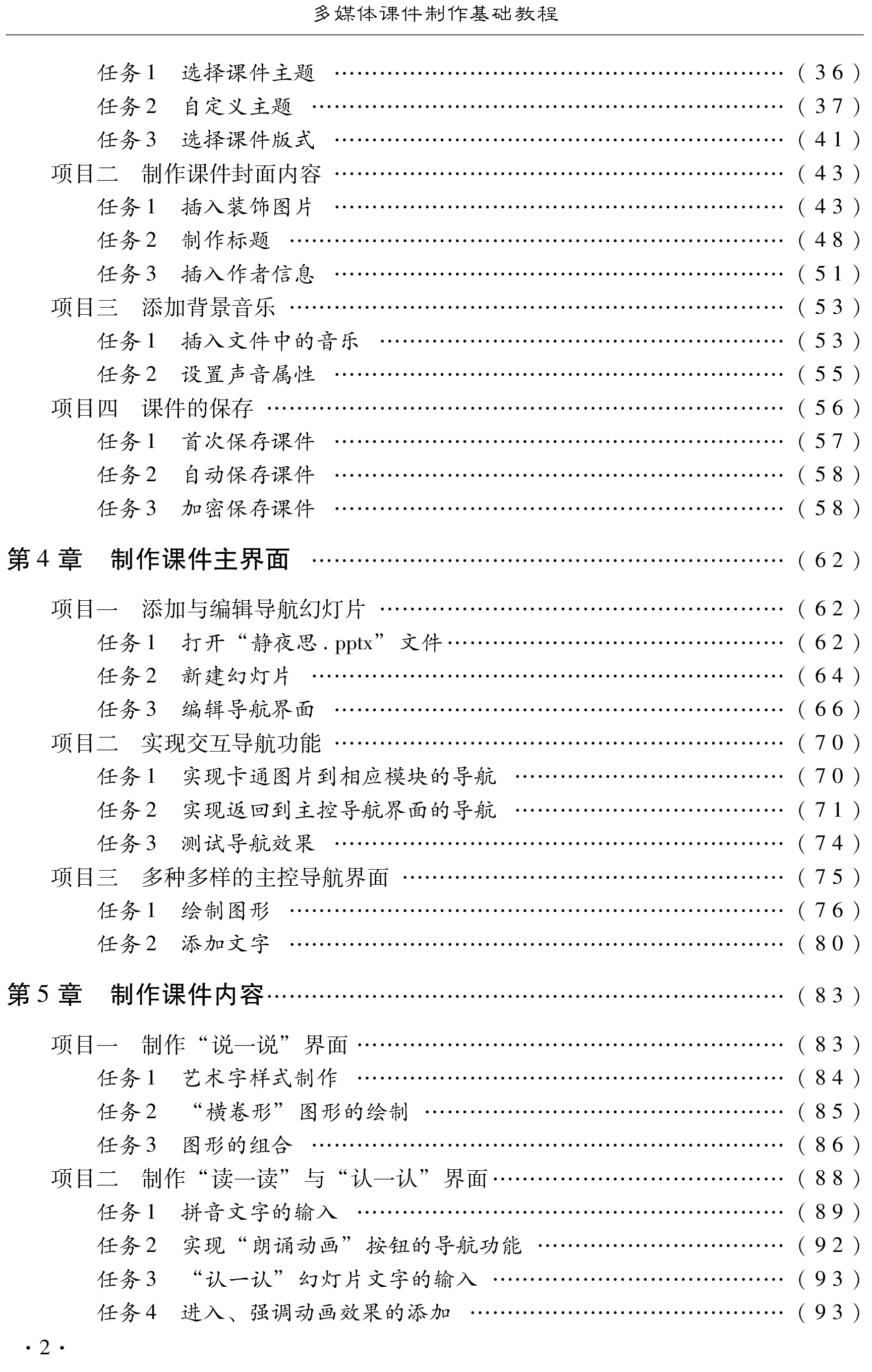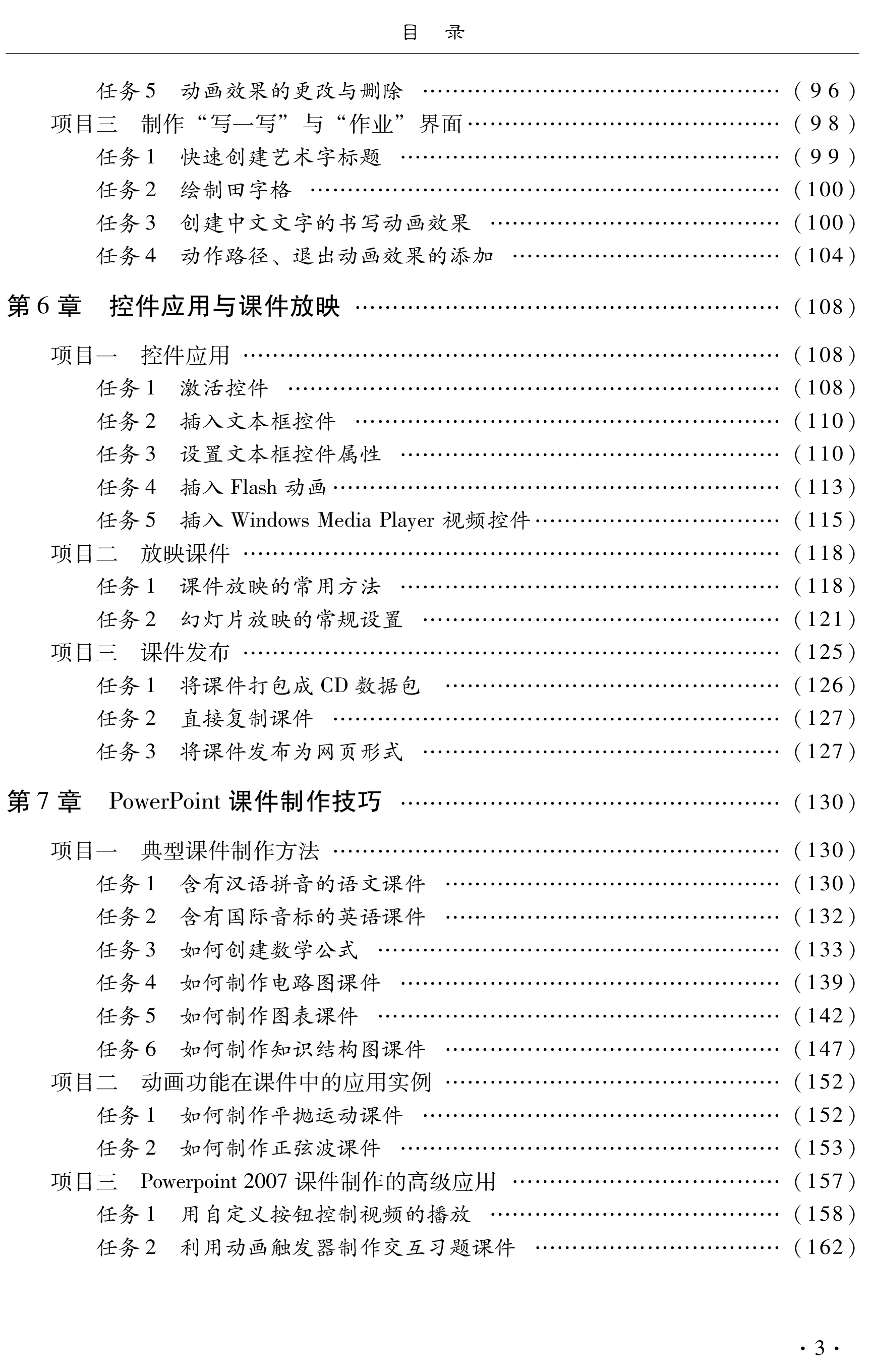 Power Point2007软件;第3~7章是课件制作的项目篇,通过具体项目,详细介绍了利用 Power Point 2007制作多媒体课件的方法与技巧;第8章是课件制作的实例篇,介绍了课件制作的设计思想、制作步骤与方法,为师范类院校学生在今后教学中使用多媒体课件提供指导。