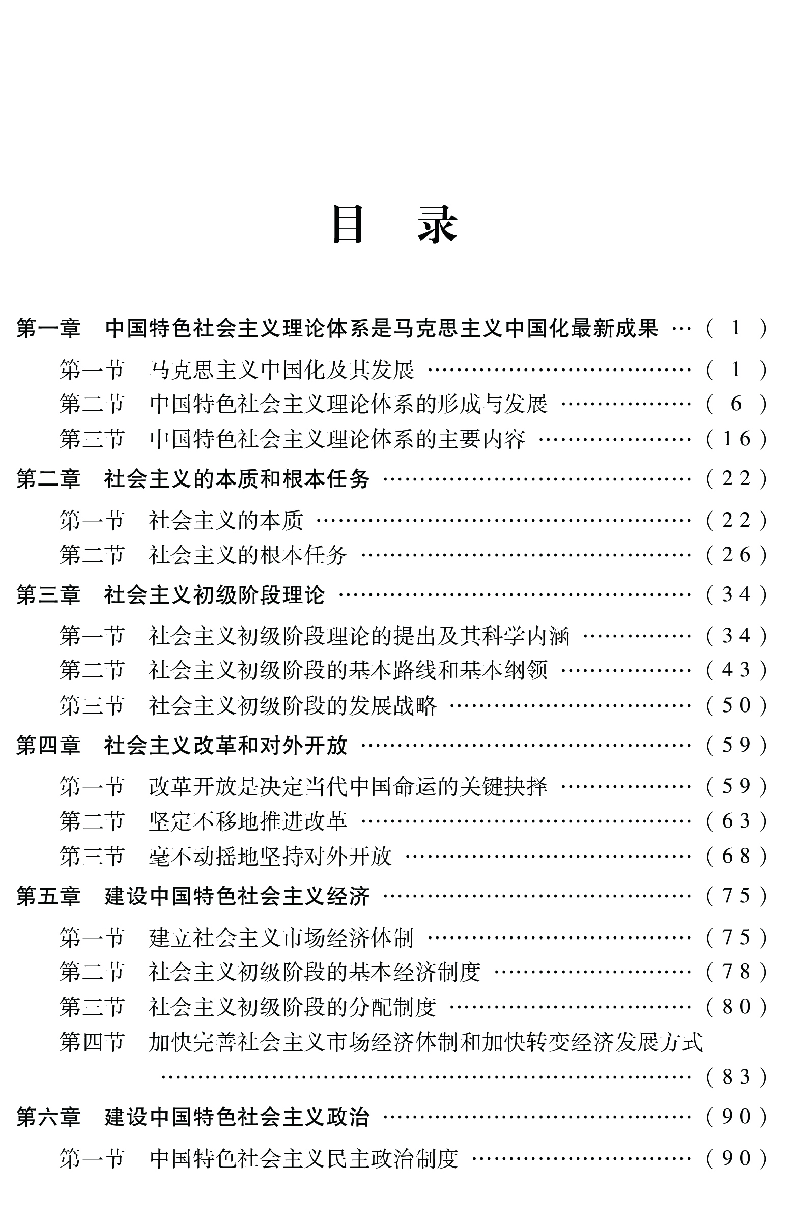 教材由十三章组成,共分为五个模块。其中概述篇(第一章),基本理论篇(第二章至第四章),总体布局篇(第五章至第九章),国防和军队篇(第十章),其它理论篇(第十一章至第十三章)。分别阐述了马克思主义中国化的最新成果、社会主义本质论、社会主义初级阶段论、社会主义改革开放论,系统介绍了中国特色社会主义“五位一体” 的总体布局,以及国防和军队建设、祖国统一事业、外交和国际战略、中国特色社会主义事业的领导核心等内容。
